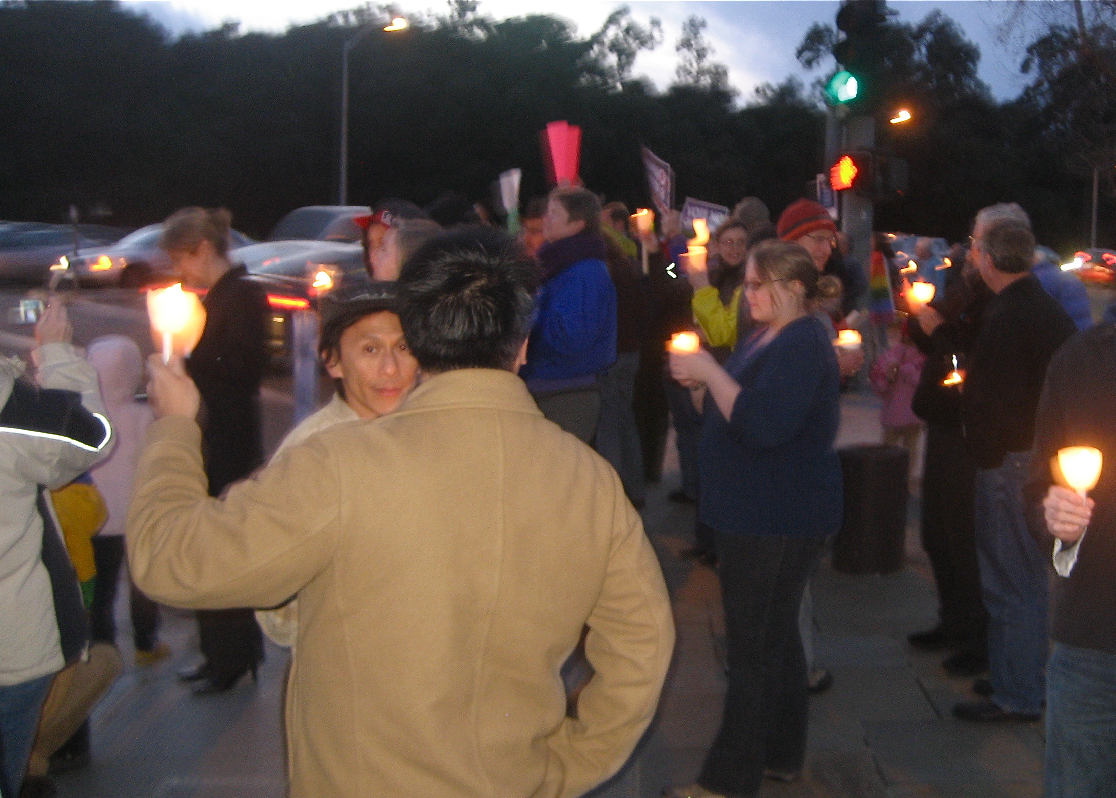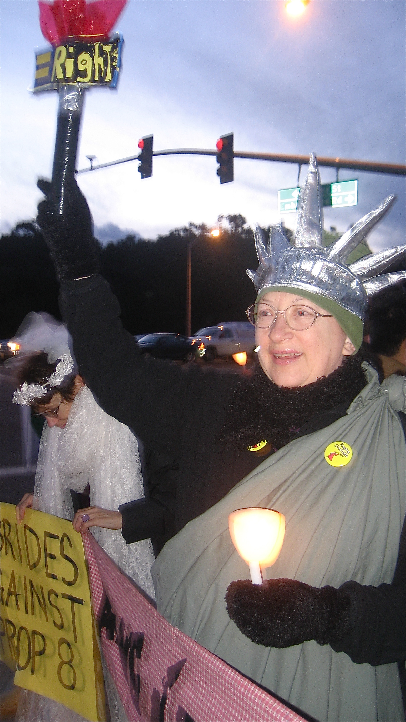 which voters narrowly approved in November 2008. So on the *Eve of Justice* demonstrators in Palo Alto, some dressed as brides, stood at the corner of El Camino and Embarcadero to make the case for the right to marry.