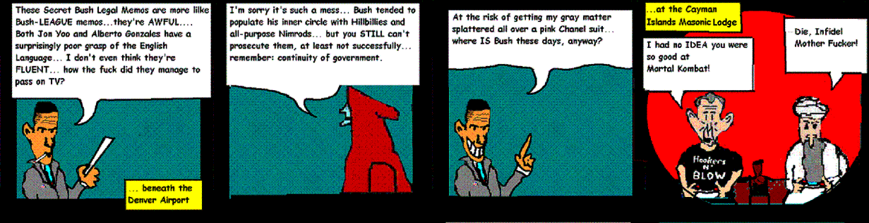 Obama is horrified to discover that John Yoo and Alberto Gonzale's legal writings are not proficient in the English language.