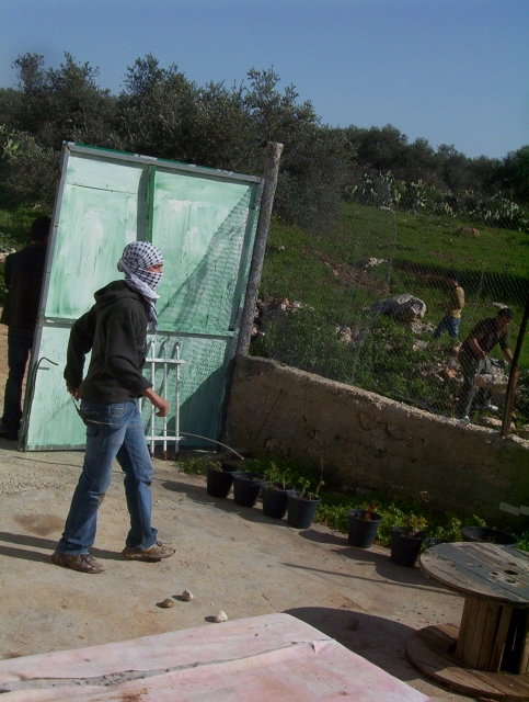 Every Friday Ni'ilin villagers are joined by Israeli and international activists to protest against the Wall's construction. Over one hundred people gathered for an open air prayer in one of the village's olive groves. After prayer the crowd marched to the area where the wall is being built across their land. Villagers began breaking down the razor wire barrier along the construction zone. Soldiers arrived in a jeep and began firing tear gas into the crowd. The demonstrators were forced to retreat. As they retreated, other soldiers positioned in the olive groves attacked them with more tear gas. A international activist (from Sweden) was hit in the stomach with an extended range tear gas grenade. Youth threw stones with slings and villagers and supporting activists tried all day to again walk towards the Wall.