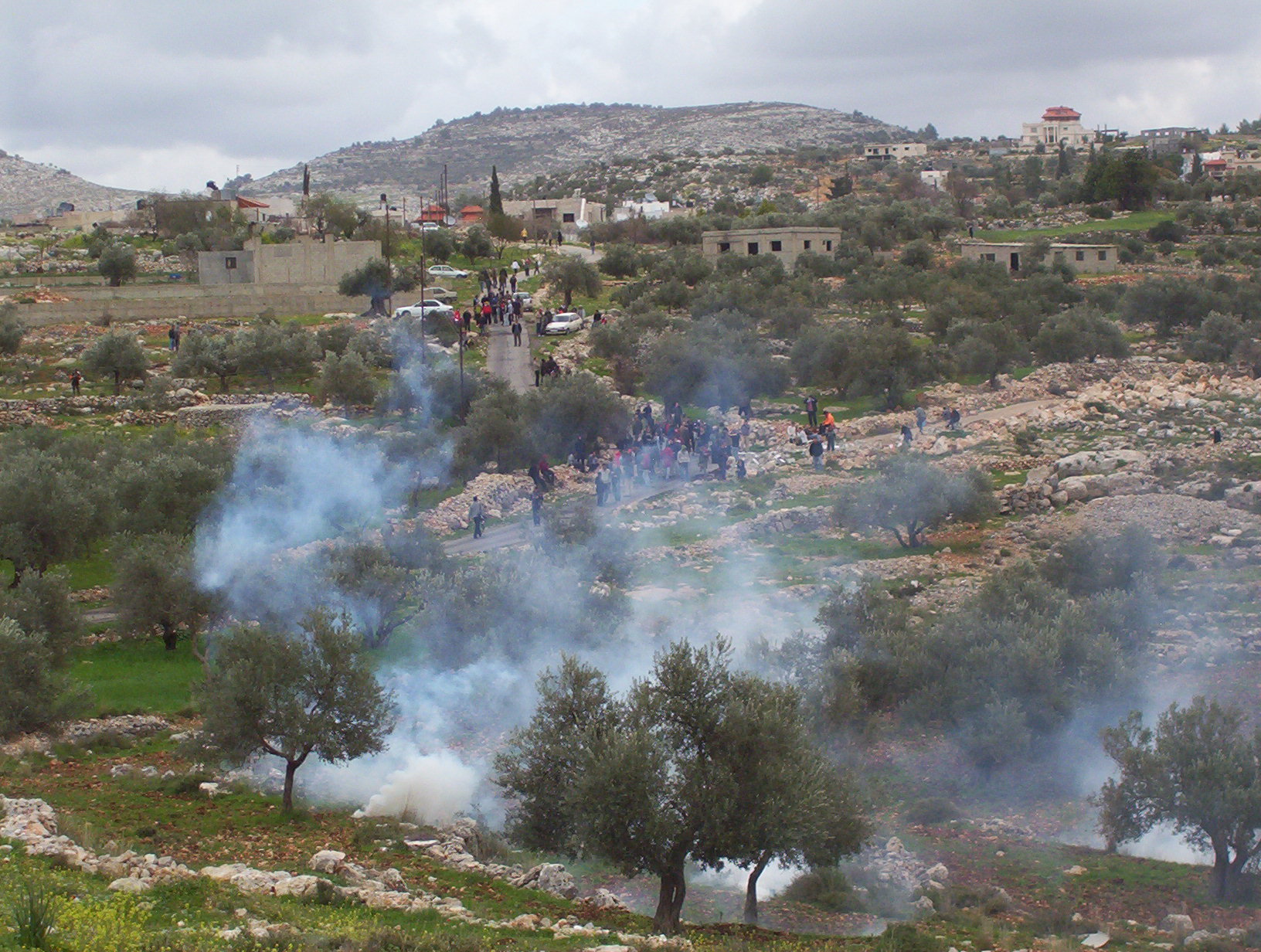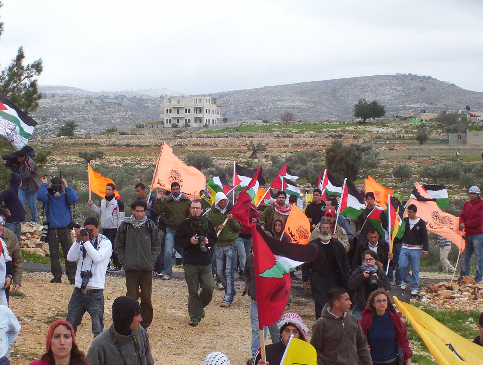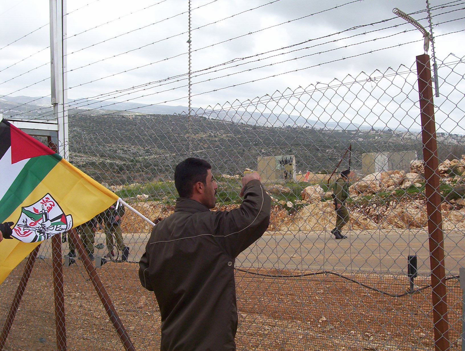 The village of Bil'in has fought for four years against the Apartheid Wall. The wall steals much of the villagers land and is part of the Israeli plan to smash Palestine into tiny pieces. For the anniversary many villagers, journalists, foreign and Israeli activists and even politicians came. The day started with prayers in the mosque. There was a march of over 500 people to the Wall. The Apartheid barrier is called the Wall but in this location it is made up of two rows of razor wire, a trench, two fences and an access road. The fence not only takes up a swath of Palestinian land but allows soldiers to control access to the land on the other side at all times. We marched to the Wall, fence and several people opened a gate. The soldiers were ready on the other side and fired tear gas. May people ran away but others moved closer. The soldiers do not have gas masks and thus do not use gas too close. Many people argued with the soldiers in a diversity of languages. Finally they threw enough tear gas that everyone was driven back. Young men and boys then used slings to throw stones at the soldiers. At the end of the day the soldiers used a contraption that fires 64 tear gas canisters at once. This drove off many people but a few stayed to throw more stones.