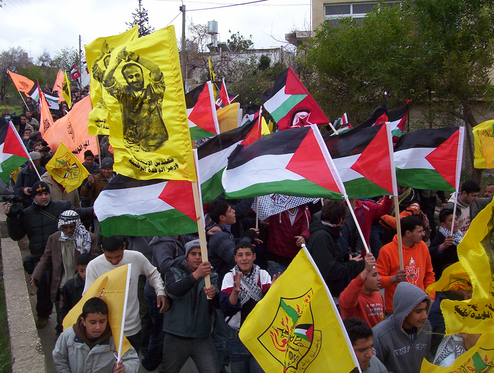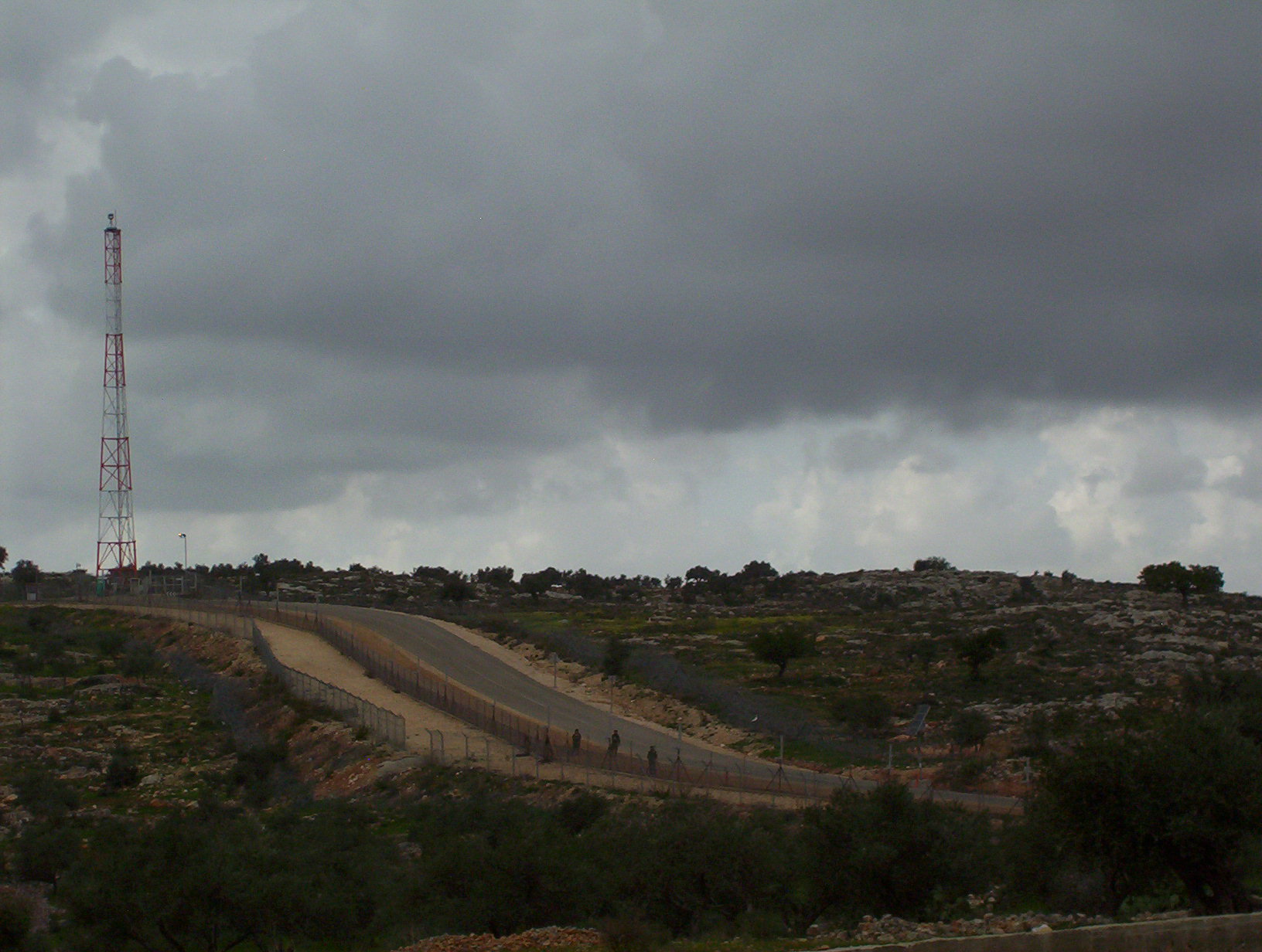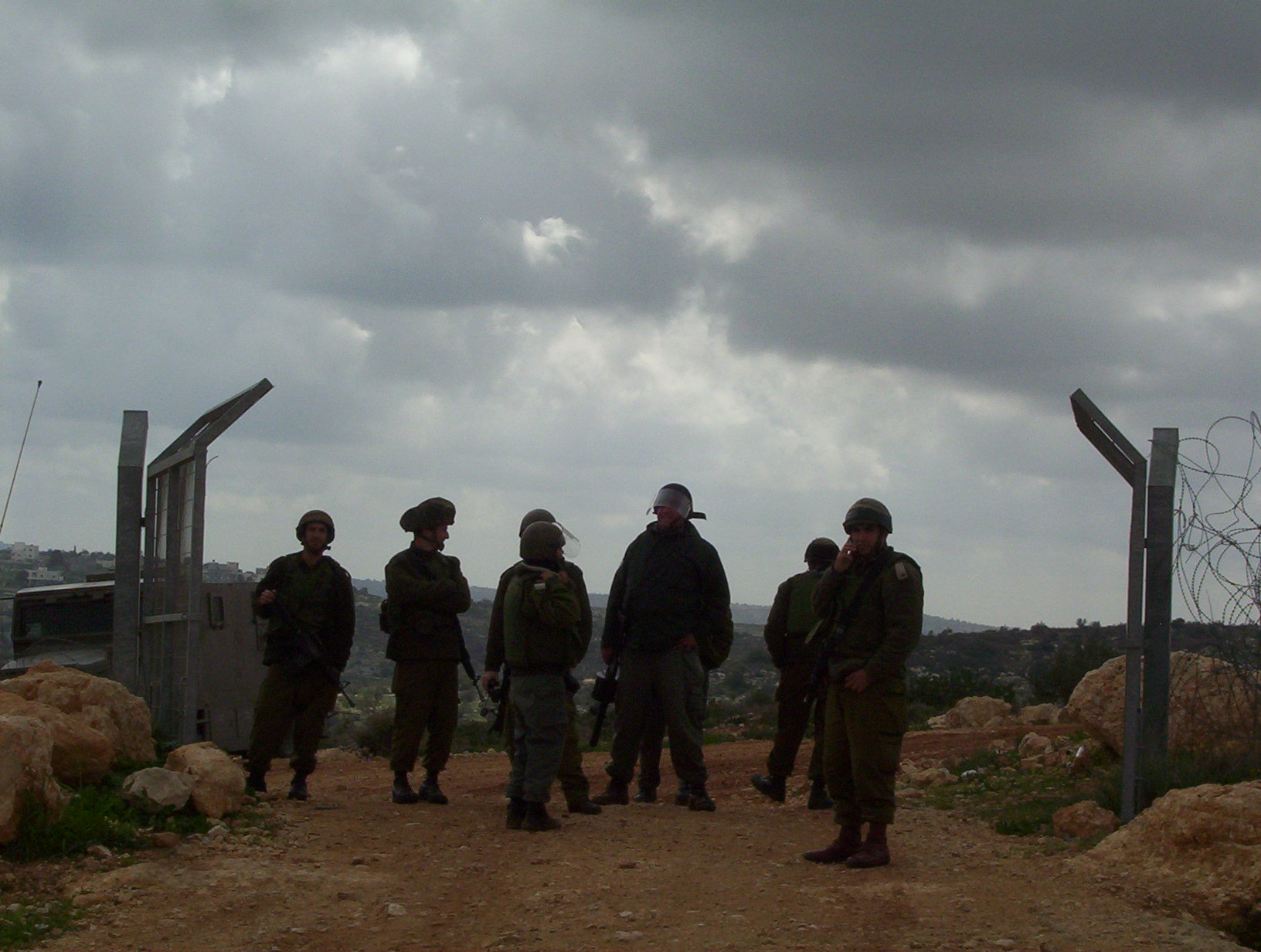 The village of Bil'in has fought for four years against the Apartheid Wall. The wall steals much of the villagers land and is part of the Israeli plan to smash Palestine into tiny pieces. For the anniversary many villagers, journalists, foreign and Israeli activists and even politicians came. The day started with prayers in the mosque. There was a march of over 500 people to the Wall. The Apartheid barrier is called the Wall but in this location it is made up of two rows of razor wire, a trench, two fences and an access road. The fence not only takes up a swath of Palestinian land but allows soldiers to control access to the land on the other side at all times. We marched to the Wall, fence and several people opened a gate. The soldiers were ready on the other side and fired tear gas. May people ran away but others moved closer. The soldiers do not have gas masks and thus do not use gas too close. Many people argued with the soldiers in a diversity of languages. Finally they threw enough tear gas that everyone was driven back. Young men and boys then used slings to throw stones at the soldiers. At the end of the day the soldiers used a contraption that fires 64 tear gas canisters at once. This drove off many people but a few stayed to throw more stones.