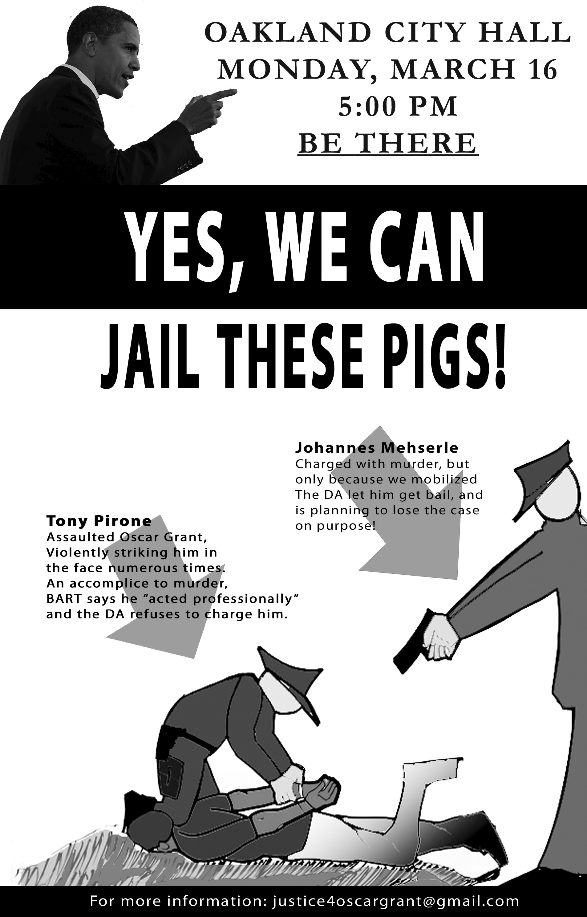 This is the MOMENT. We are sick and tired of being ignored; we will no longer sit back while the police are allowed to get away with televised executions. We will not stop until we see justice. We DEMAND that Tony Peroni be fired and charged. Officer Tony Peroni was “caught on camera” striking Oscar Grant in the face numerous times for no reason. He set the tone for the execution of Oscar Grant. Officer Tony Peroni is just as guilty as Johannes Meserlie. WE WILL NOT LET HIM GET AWAY WITH WHAT HE DID!!!!!! Right now he is on “PAID ADMINISTRATIVE LEAVE” AKA VACATION; LETS PUT THIS PIG WHERE HE NEEDS TO BE (BEHIND BARS)…..this event is CRUCIAL . THIS IS THE MOMENT TO TAKE A STAND! MONDAY MARCH 16TH @ 5PM OAKLAND CITY HALL.