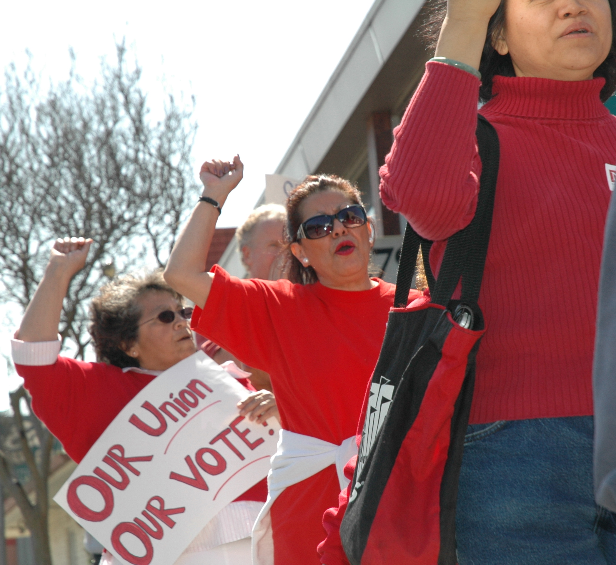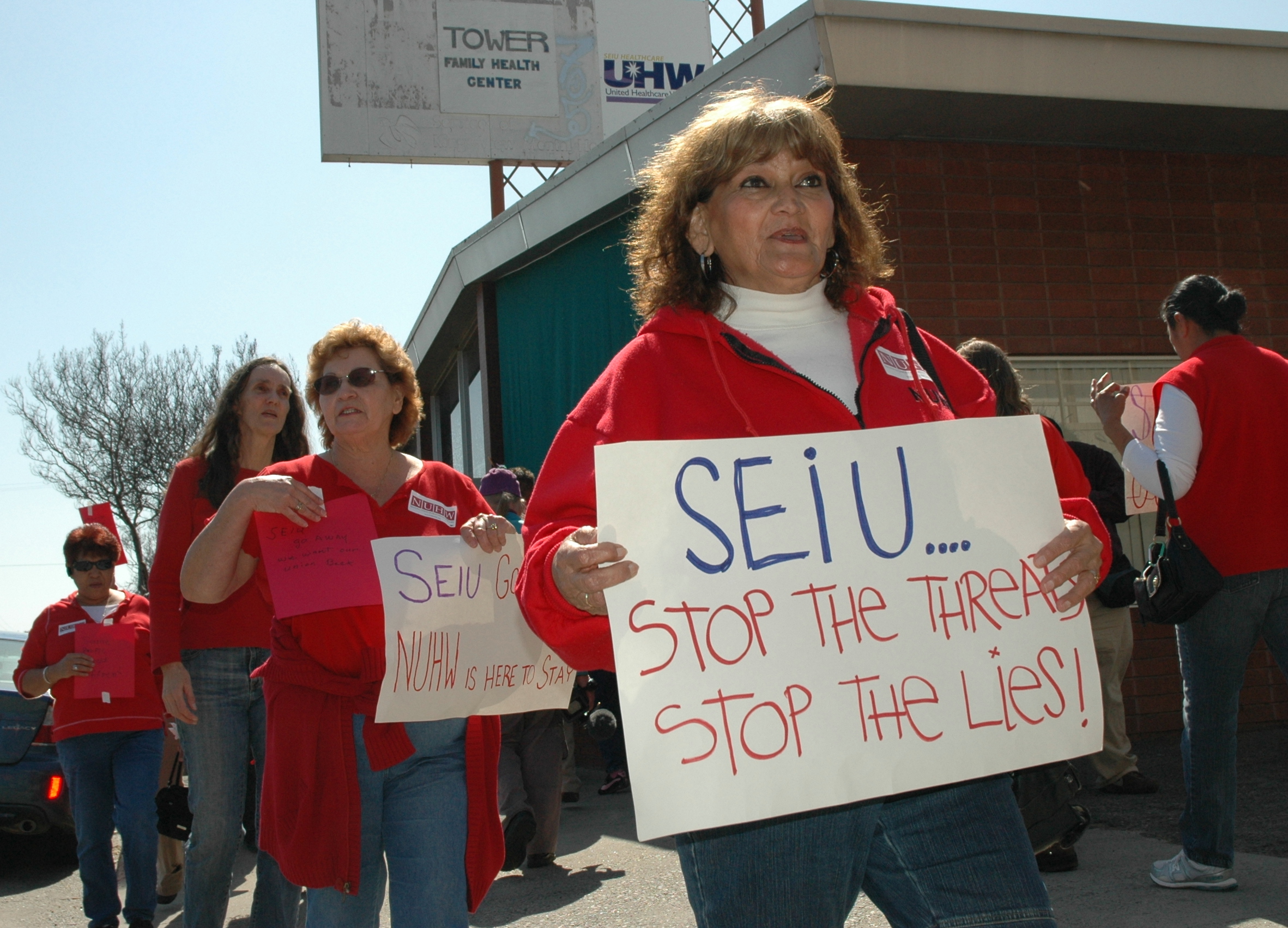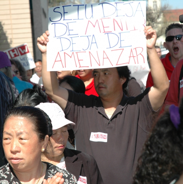 About 60 homecare workers and their allies rallied in front of the Service Employees International Union-UHW office in Fresno today. The workers want to disaffiliate from SEIU and join the National Union of Health Care Workers (NUHW). The union locked their doors, hid behind the curtains, took pictures of the members at the rally, and called the police. SEIU-UHW staff would not allow their own union members into the building.