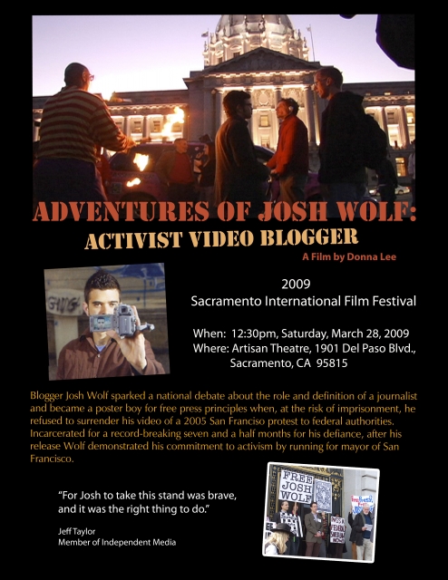 My short documentary, "Adventures of Josh Wolf: Activist Video Blogger," will be screening at the Sacramento International Film Festival: