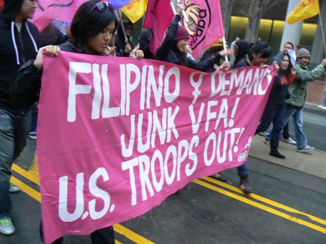 The protest in San Francisco this year seemed a bit smaller than in past years. The starting rally at 11am seemed even smaller unless you walked around a bit. The main stage was in Justin Herman Plaza but there were two other stages nearby; a labor contingent against the war had a stage South of the main plaza and BAYAN and and a few other groups had speakers North of it in Embarcadero Plaza.