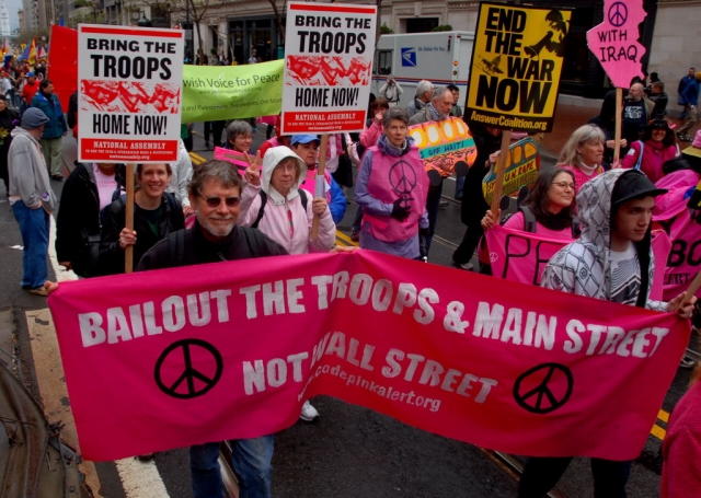 Several thousand people gathered in downtown San Francisco Saturday morning, despite the threat of rain, for a peaceful march and rally against the on going wars in Iraq, Afghanistan and occupation of Palestine. With the dire state of the American economy the protest had a strong emphasis on the dollar cost of United States military involvement.