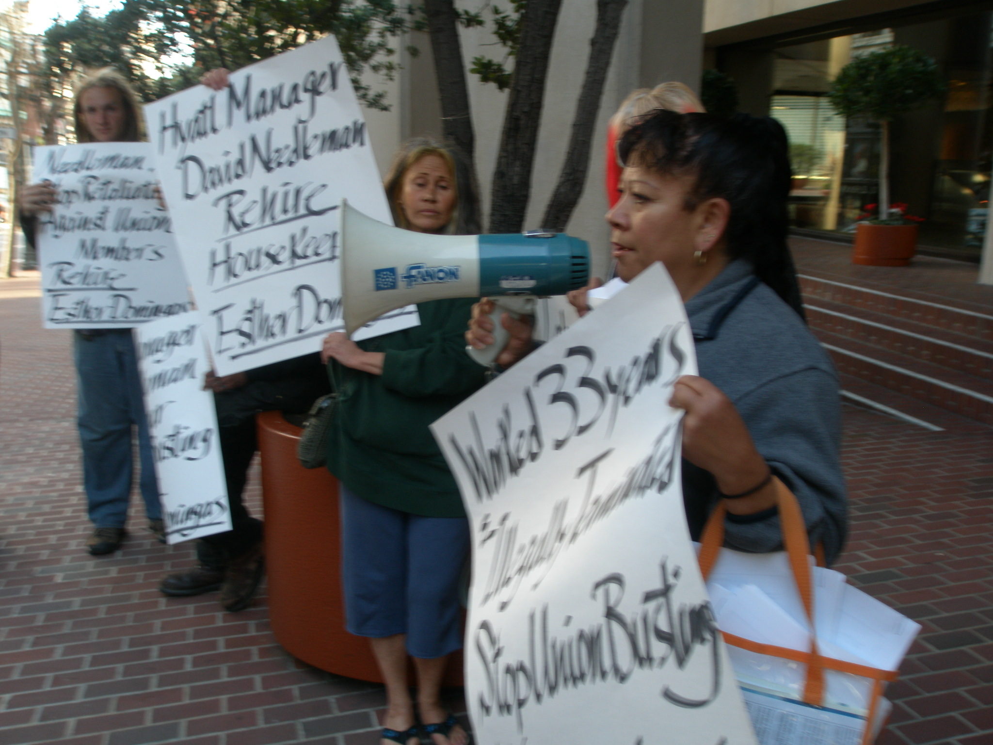 Hyatt management is certainly unfair and anti-union (see their current opposition to workers' attempt to organize at the Hyatt Fisherman's Wharf). And hotel room cleaners certainly are very overworked and undercompensated. But you should really think about who you pick to hold your picket lines for. It doesn't look like any of Ms. Dominguez's co-workers were out there on the picket line with y'all. There's a reason for that: they know she's a scab.