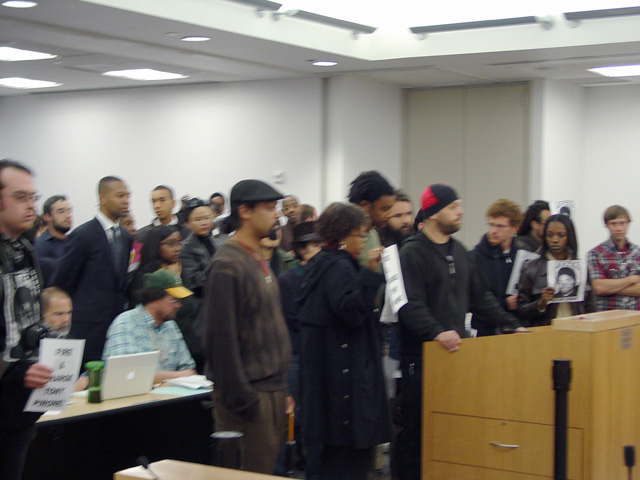 After numerous speakers, some of whom are pictured here, NJNB was negotiating with the BART Board over their broken promise to hold public meetings at times convenient for working people in Oakland. As April 25th was being discussed as the date for the first justice for Oscar Grant public hearing, at a venue in East Oakland suggested by NJNB, a single demonstrator threw red paint onto Dorothy Dugger, bringing the meeting to a close as police ushered everyone out of the room. Eventually, people were allowed back into the room for two brief public comments and then the meeting went into a closed non-public session.