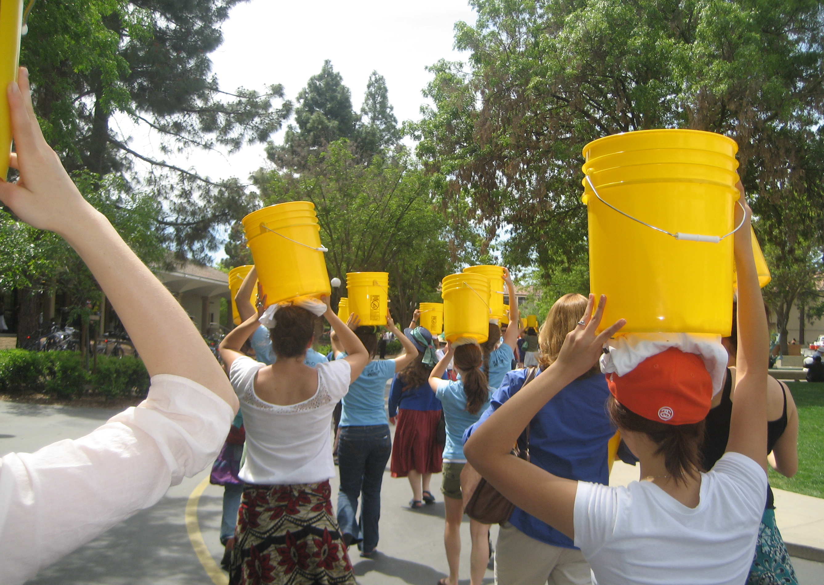 54 Stanford women students and eight young men carried buckets in a campus march to promote the cause of an organization working for access to water in Africa. Women, who bear the brunt of water hauling in African communities, are endangered when they must carry water for many miles over many hours on a daily basis. They are unable to attend school and are often at risk of sexual assault as they travel back and forth to water sources. Improved water supply can also promote the cause of world peace, said the founder of Nuru International, the organization behind today's event.
