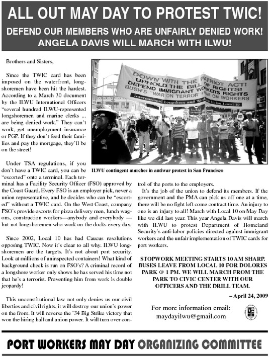 * Support ILWU #10 decision to stop work in Bay Area ports on May 1, 2009 to protest repression of port workers and immigrants by the Department of Homeland Security.