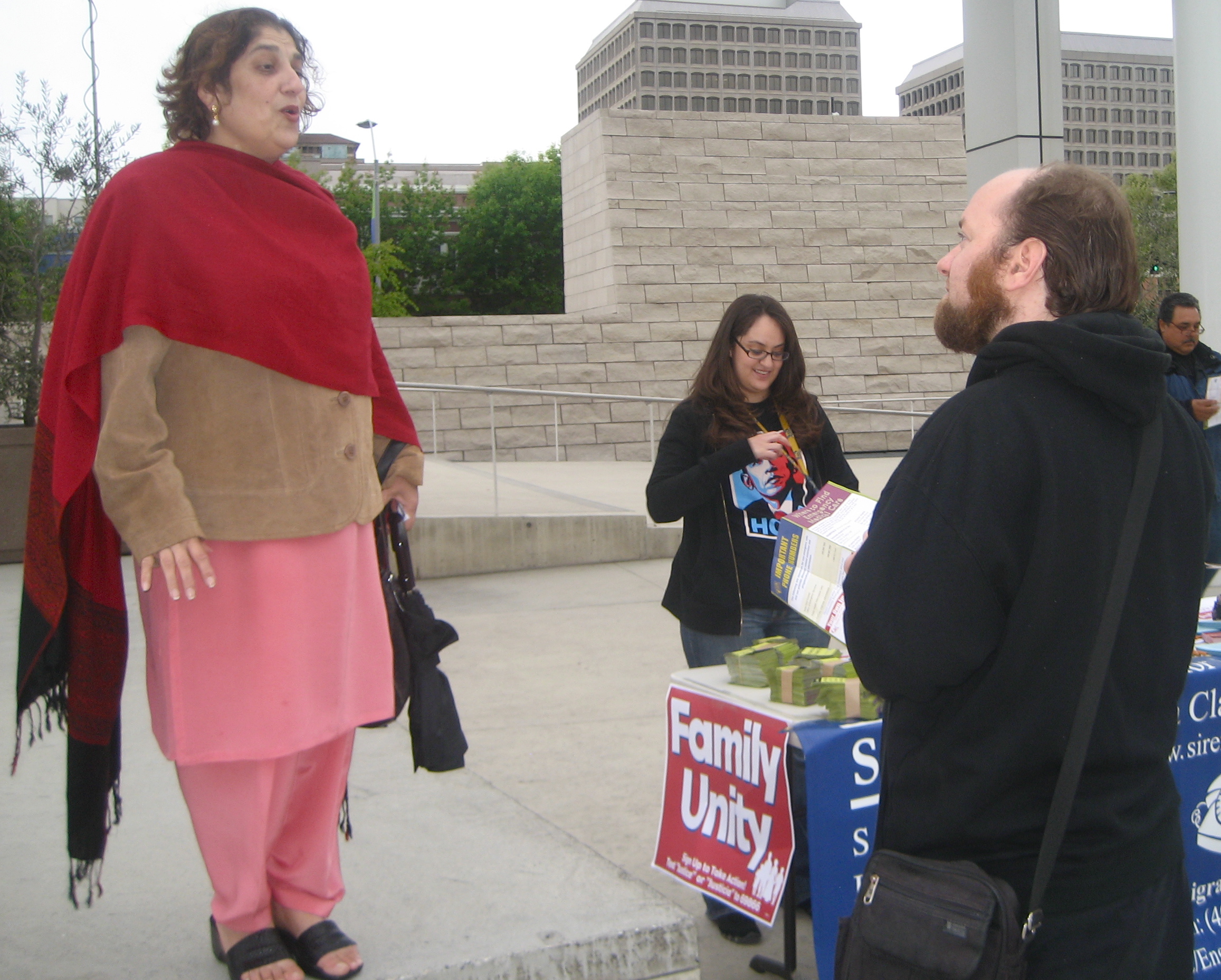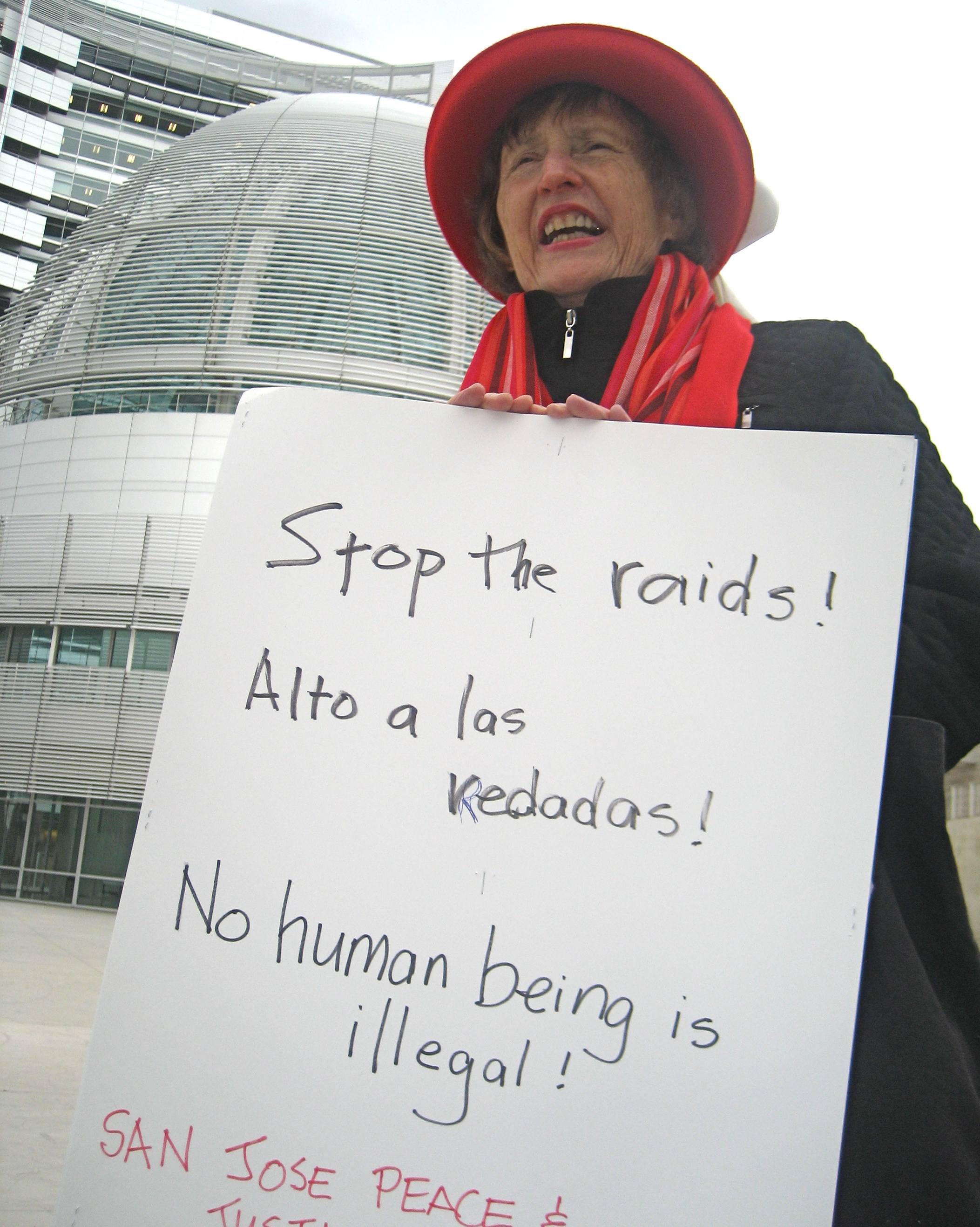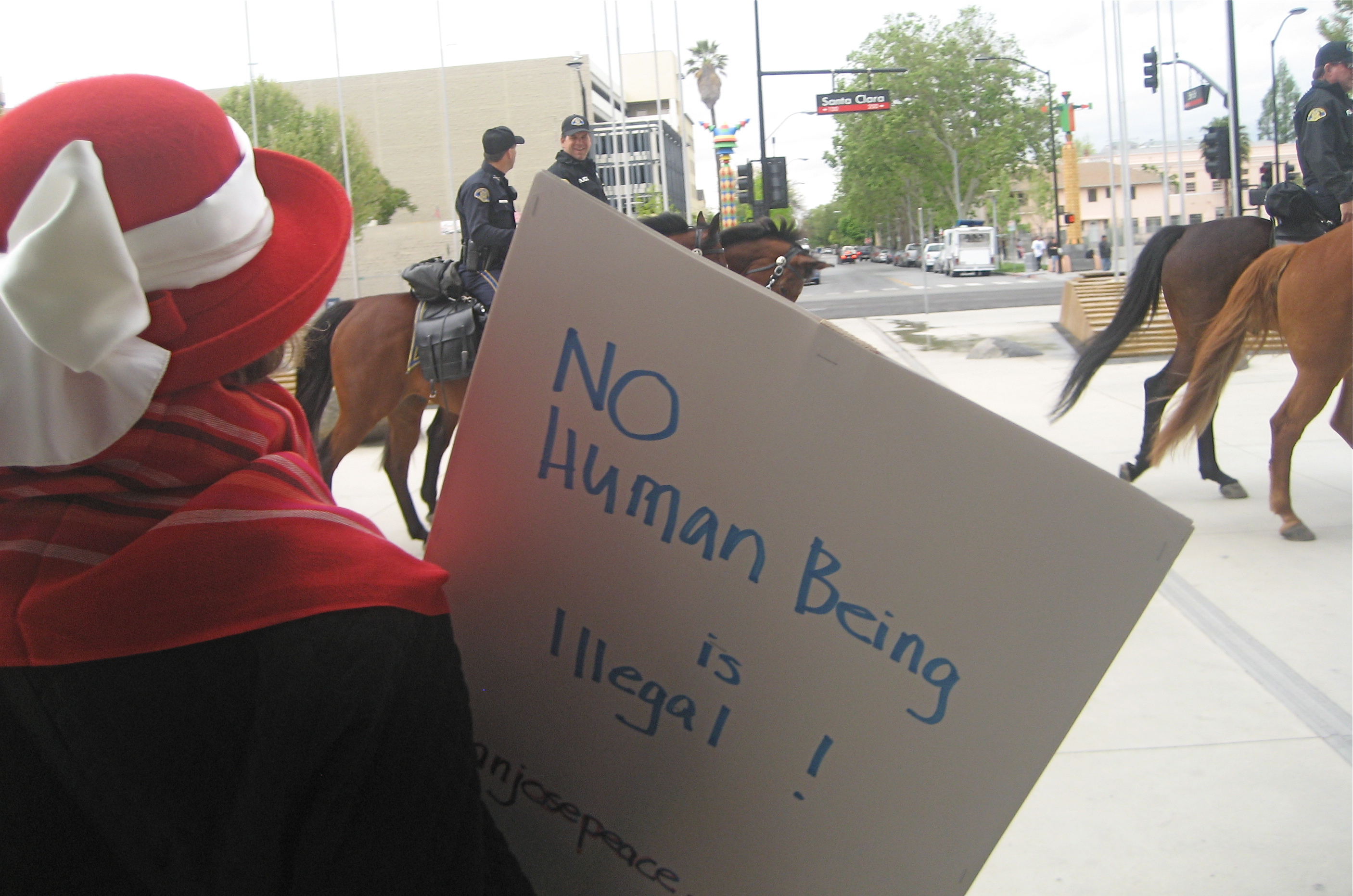 Top photo: A Raging Granny with "No Human Being is Illegal Sign" watches mounted police trot by.
