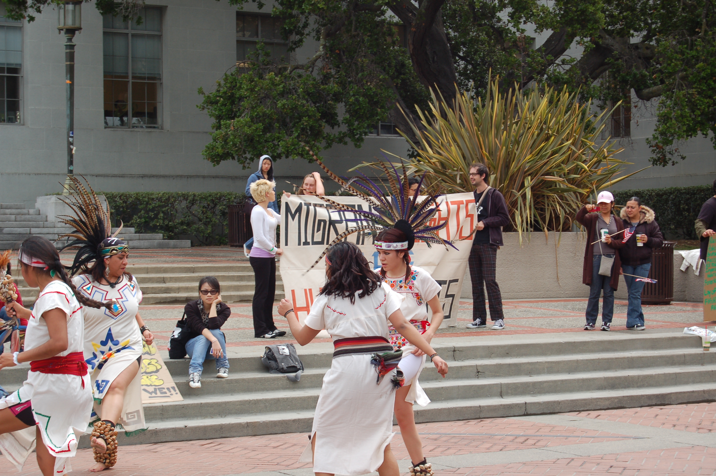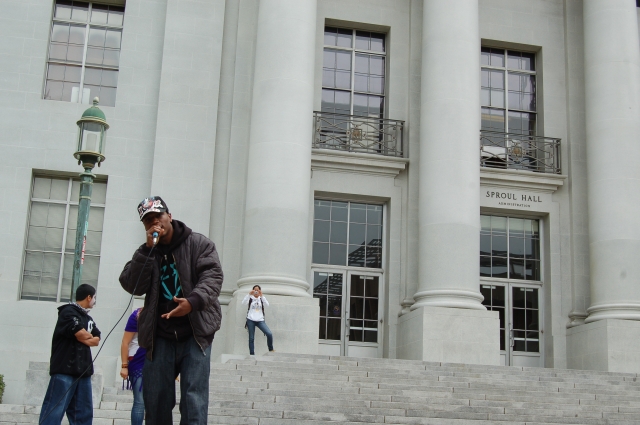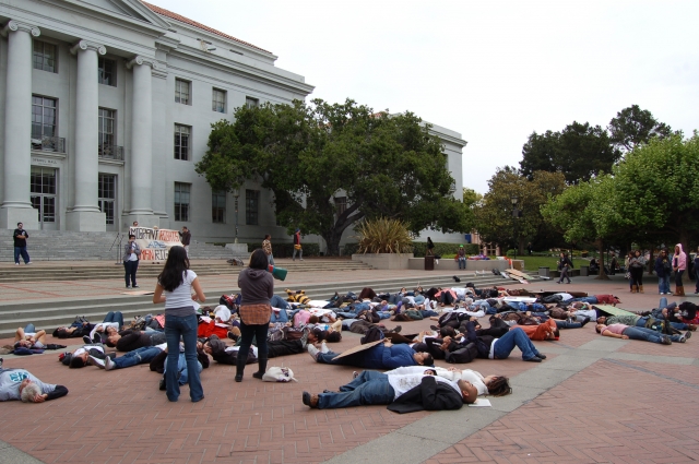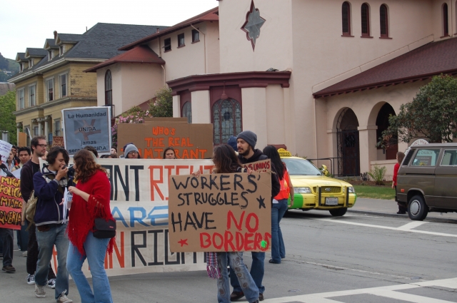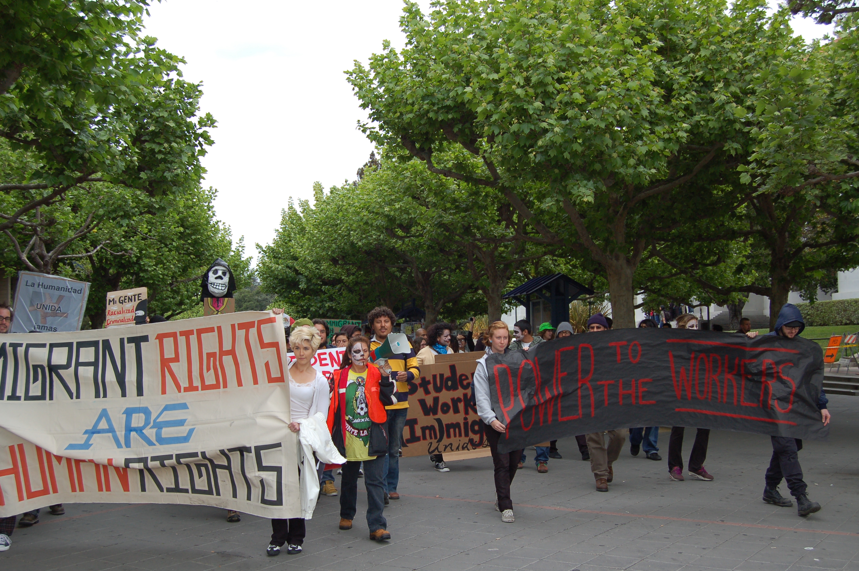 On May 1, students and community members demonstrated at UC Berkeley for workers and human rights. At 1:30 the demonstrators left and marched to Ashby Bart station.