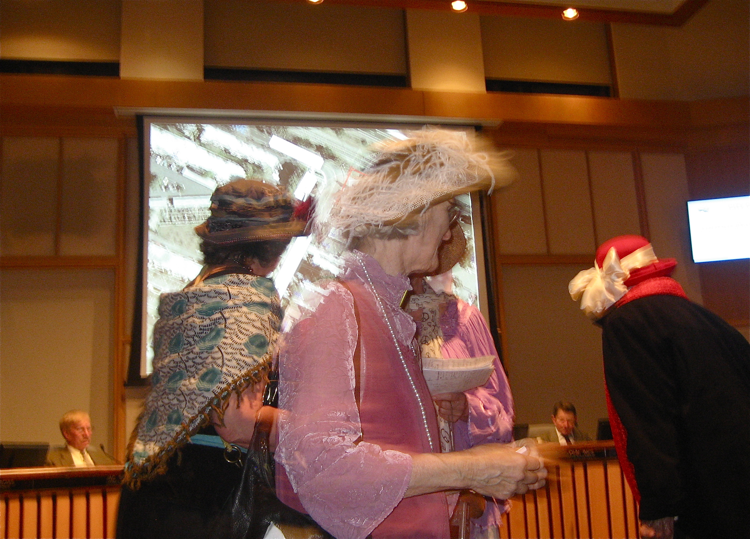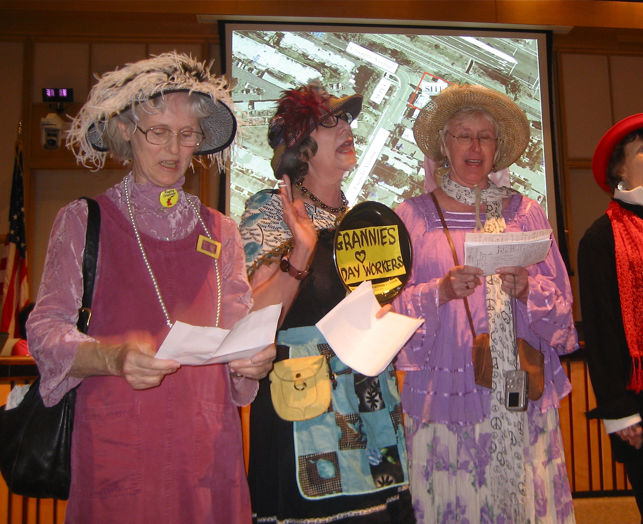 Top photo: Good News! Happy on May 12, Raging Grannies receive the news that the City Council unanimously rejected the NIMBY (Not in My Back Yard) neighbors' appeal of the Day Worker Center use permit.