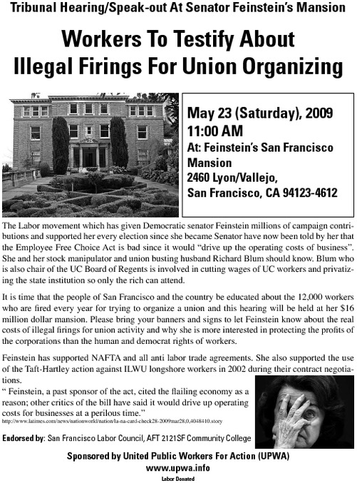 There will be tribunal on union busting at the multi-million dollar mansion of Democratic Senator Diane Feinstein. She is opposing the EFCA act saying it is bad for the economy
