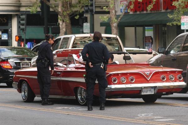 During those two half-hour intervals on four blocks of Santa Clara Street, there were no fewer than 14 separate cars stopped by San José police in what appeared to be deliberate fishing expeditions. This amounts to nearly one stop every four minutes. In the majority of cases, a citation was issued. One case led to an arrest, with a passenger being asked to drive the car home. Another case involved a time-consuming inspection of the rear of the vehicle. Several cars were eventually released without citation. Due to keeping a distance from the incidents, in only one case could I overhear the police conversation. It was a case of driving without a license, which resulted in a citation and calling for another family member to come and drive the car home.