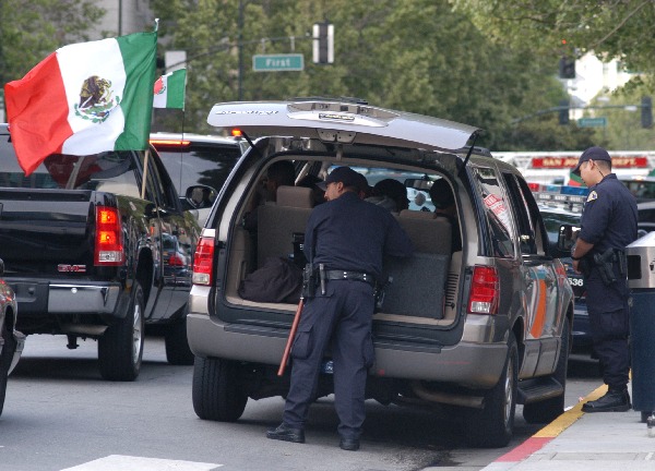 The most troubling observation on Cinco de Mayo was the police stop of a lowrider Chevrolet station wagon in the median of Santa Clara Street near First Street at around 7:25 pm. The San José police officer apparently asked for the driver licenses of all persons in the vehicle, not just that of the driver. The lead photograph shows him holding three California driver licenses in his right hand. If the stop was for a potential traffic violation, only the license of the driver should have been requested. If the passengers were in violation, for example, for possession of open alcoholic beverages, they would have been cited. The car was eventually released without citation, suggesting that no violation was found. Alternatively, if the stop was for a general identity check, then it was a fishing expedition. Finally, if the stop was effectively an immigration check, it would presumably be under the 8 CFR 287 (g) program, in which Chief Rob Davis has never publicly agreed to participate.