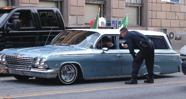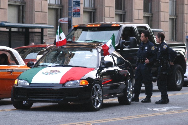 With Mexican flags and music, Cinco de Mayo was celebrated in San José on May 3, 2009 with the usual pride and enthusiasm. People were just trying to have some safe fun driving slowly down Santa Clara Street, the main thoroughfare from Mexican Heritage Plaza and the east side of the city into downtown. Some were showing off their lowriders and colors of Mexico. Others came by foot, bicycle, bus, and lightrail. The crowds were smaller than previous years, but that did not stop San José police from targeting Latinos.