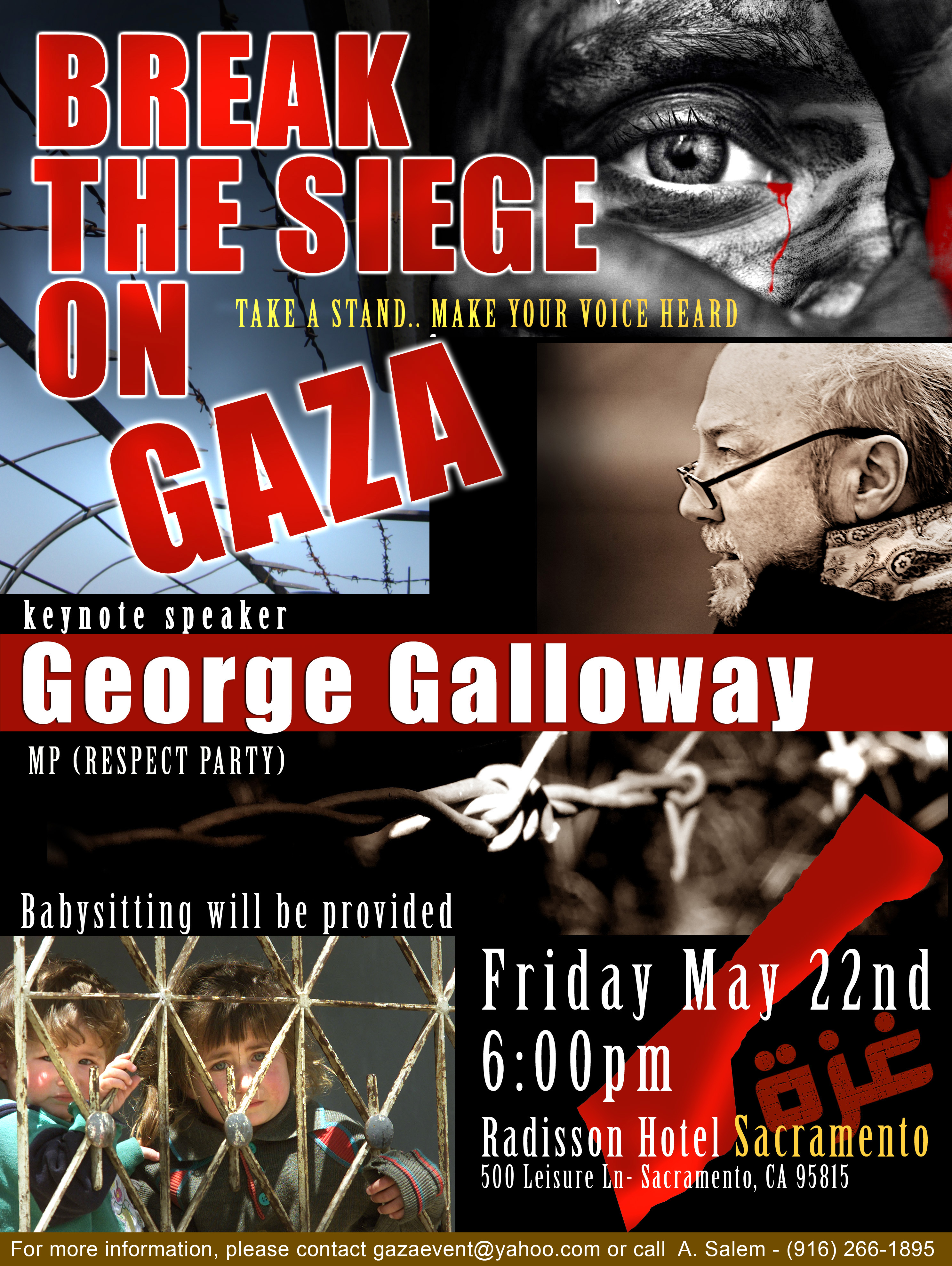 A very, very dynamic speaker against the war in Iraq, and other atrocities in the Middle East - George Galloway (a member of the British Parliament (MP) and long time peace activist - will be the keynote speaker on Friday May 22nd at 6 p.m. at a “Break the Siege on Gaza” community event at the Radisson Hotel, 500 Leisure Lane (near Cal Expo).
