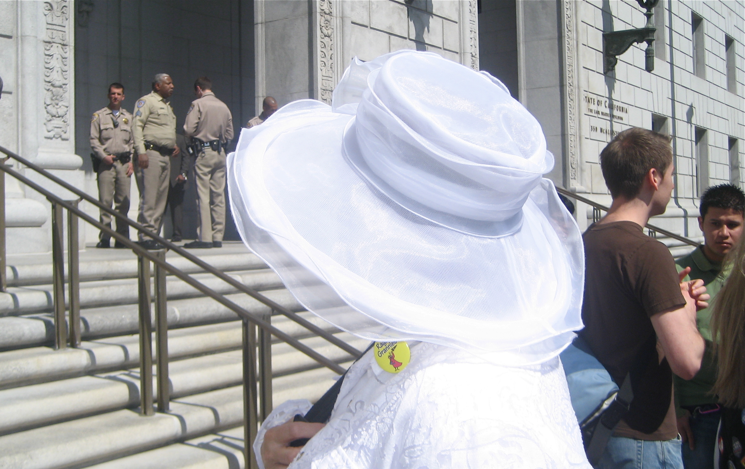 Raging Grannies gathered in bridal wear in front of CA Supreme Court steps in March.