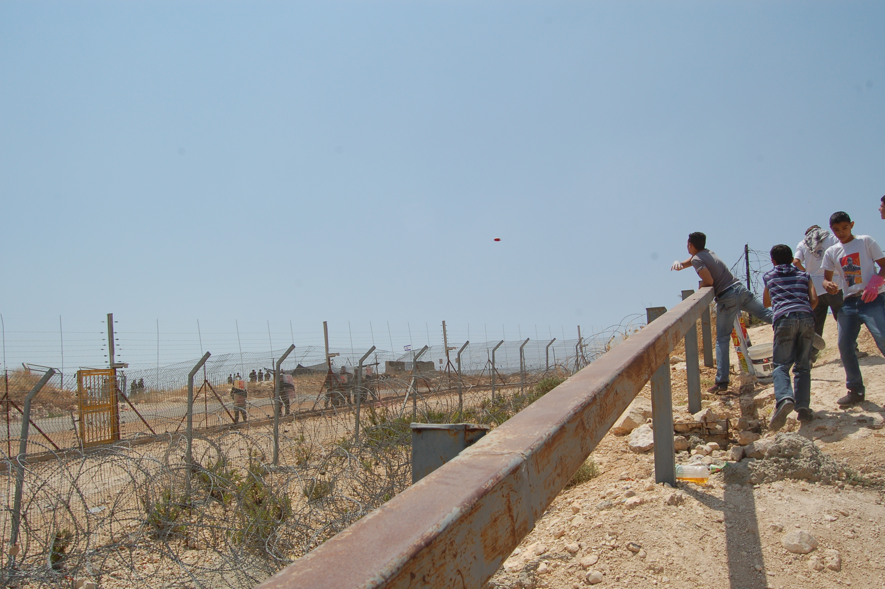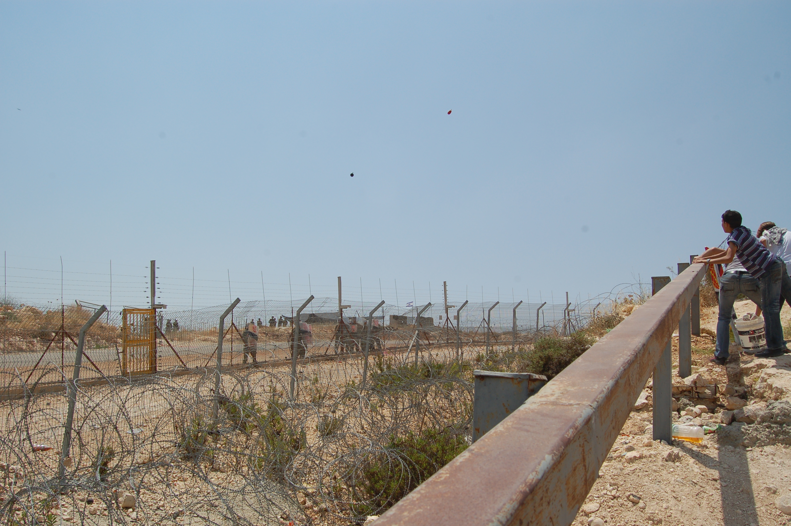 "Over 15 Israelis and over 20 internationals joined several dozens of Palestinians (including one Palestinian woman and one bicycle mounted boy) for the weekly demo in Bilin. The demonstrators marched towards the fence chanting slogans in memory of Bassem, who was murdered by the army in April, and against the annexation wall. The shabab (local youth) gathered to the right of the demonstrators (rather than on their left side as they usually do), and started the weekly unbalanced exchange of projectiles. On the s! habab side: foul manure bottles and stones; on the soldiers' side: gas, shock grenades and a few rubber coated metal bullets. The army was a little less trigger happy than usual due to an unfavourable wind direction and the presence of Israeli press invited to cover the event from the soldiers' side. A Quebecois group made a prominent appearance, carrying their provincial flag. As far as I saw several people were injured from gas inhalation, and one person was injured in his hand from a shock or gas grenade."