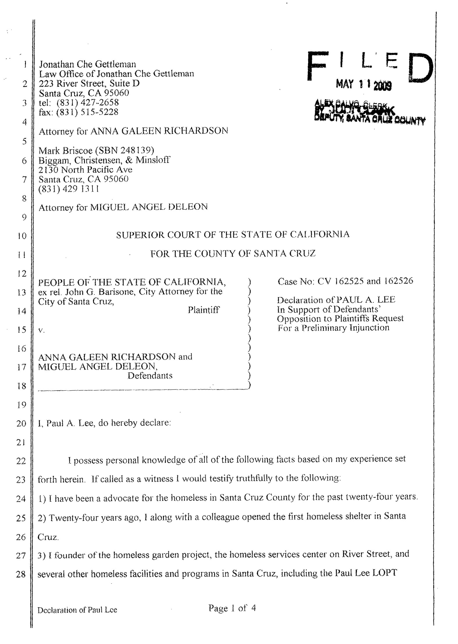 Paul Rachuy Brindel is Program Director of The Shelter Project in Santa Cruz since 1983 and manages four programs that serve homeless people. Paul A. Lee has been a homeless advocate in Santa Cruz for 24 years, as well as being the founder of The Homeless Garden Project and the homeless services center on River Street. Both experts attest that there are not enough resources to provide everyone with a bed and that homeless people should not be penalized for this.
