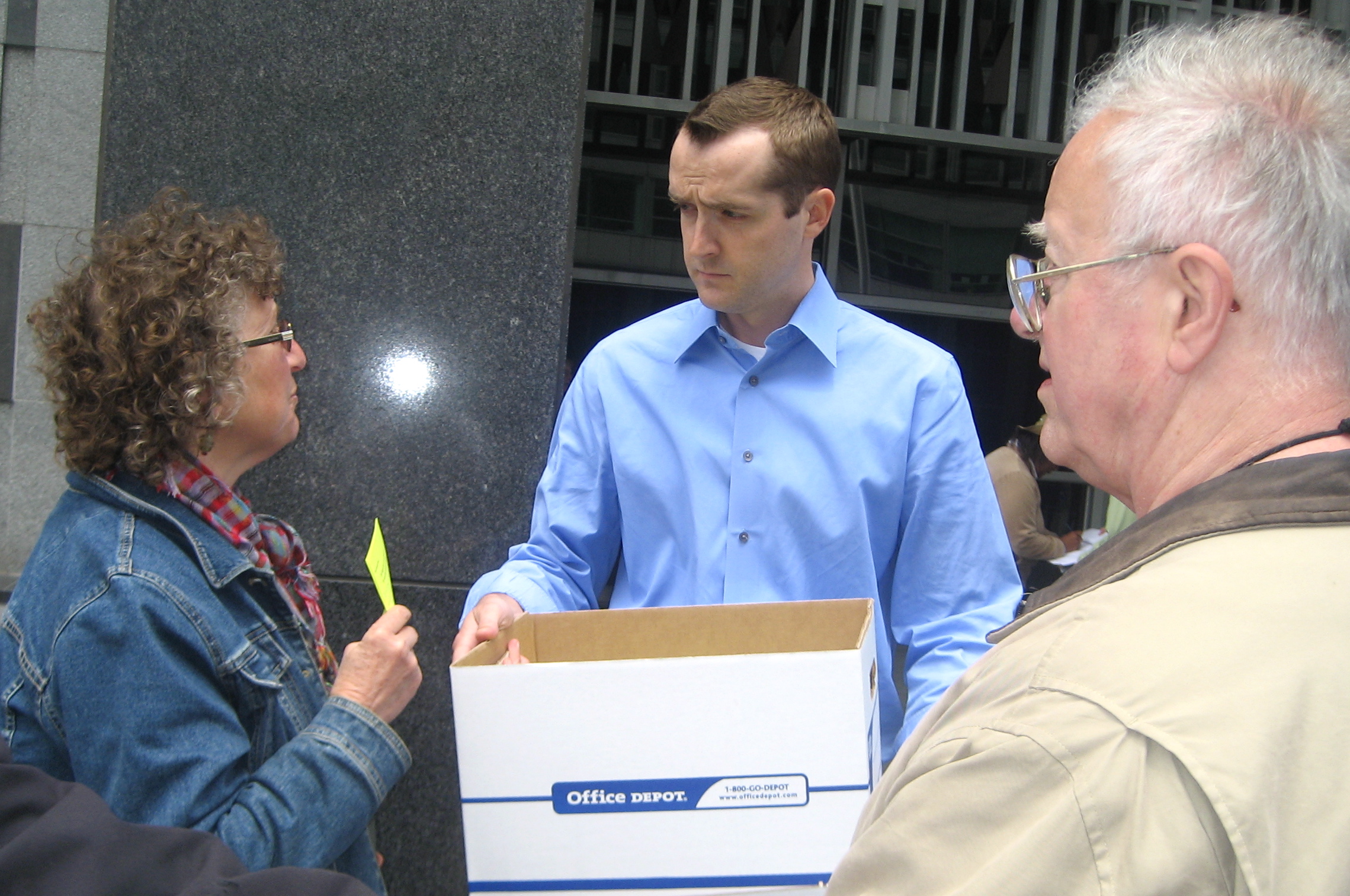 Demonstrators for Single Payer Healthcare rallied outside 450 Golden Gate, the Federal Building in San Francisco, sending their message with songs, speakers, and street theater. They then entered the building one by one to deliver bright yellow cards demanding that Speaker Pelosi “put single payer on the table!”