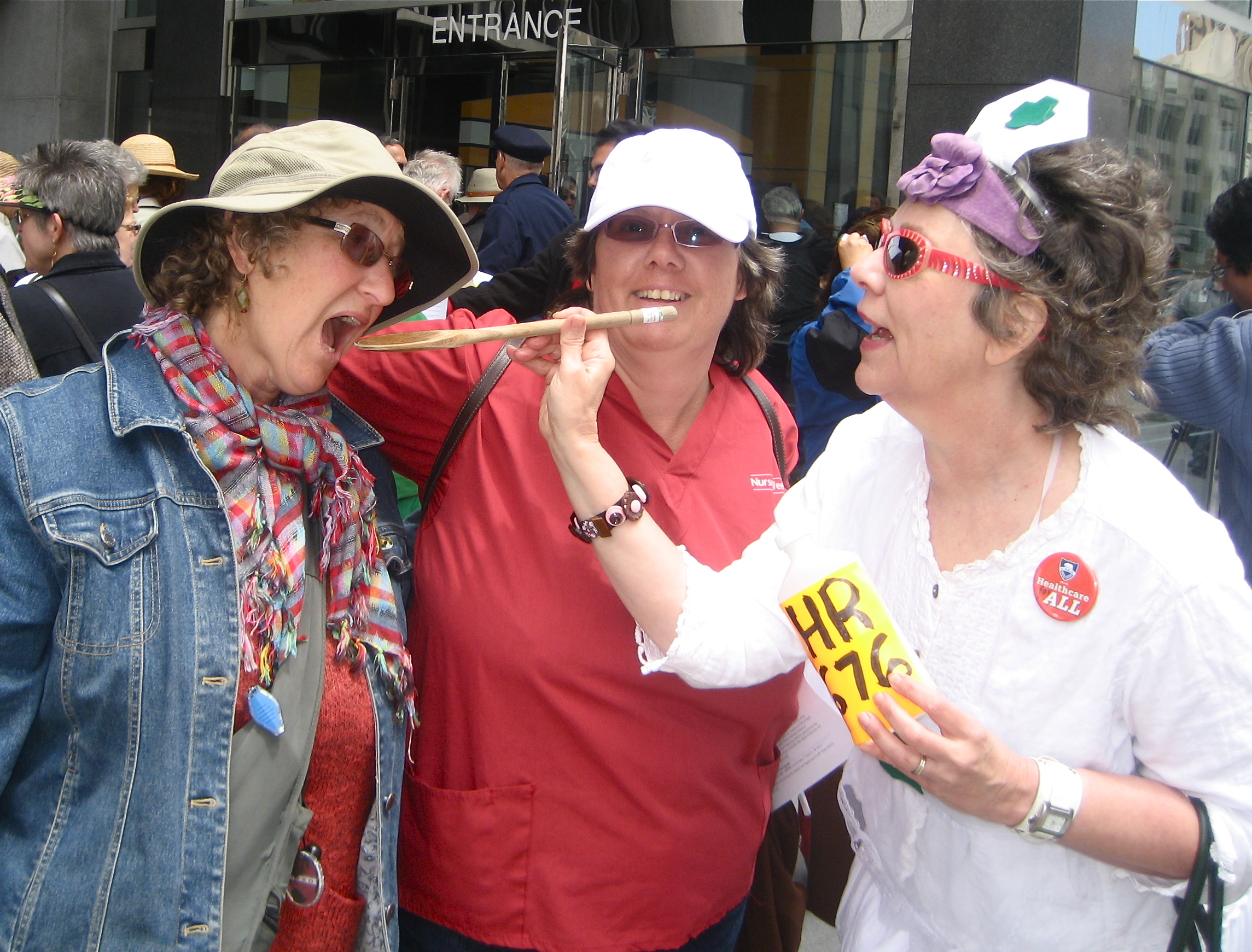 Today's rally in front of the Federal Building in San Francisco was part of National Days of Action in over 50 cities to get the message to lawmakers to enact Single Payer Healthcare. House Resolution 676 is sponsored by John Conyers (D-Mich) but our own representative, Nancy Pelosi, is NOT a co-sponsor of HR 676. She has gone so far as to declare it "off the table".