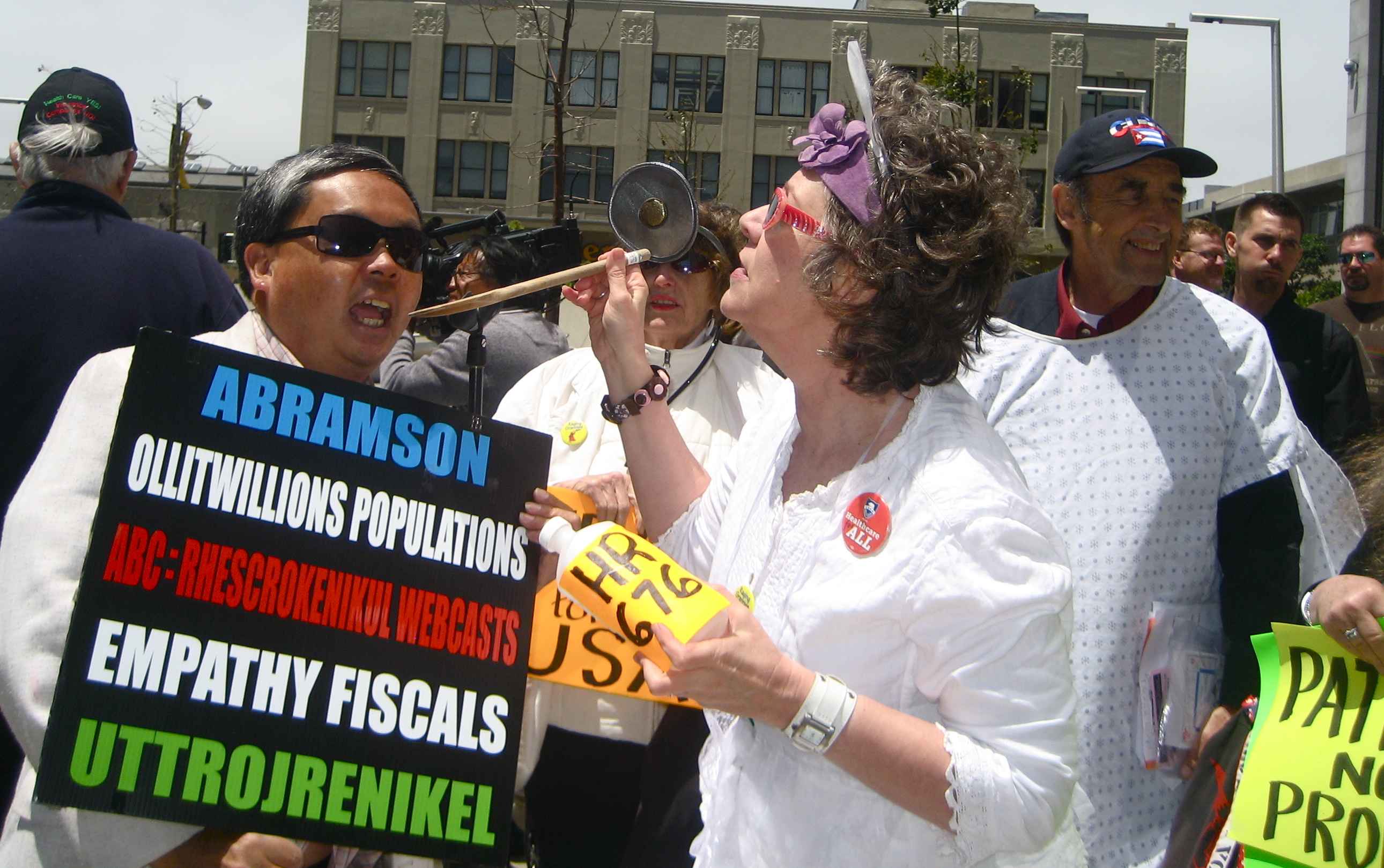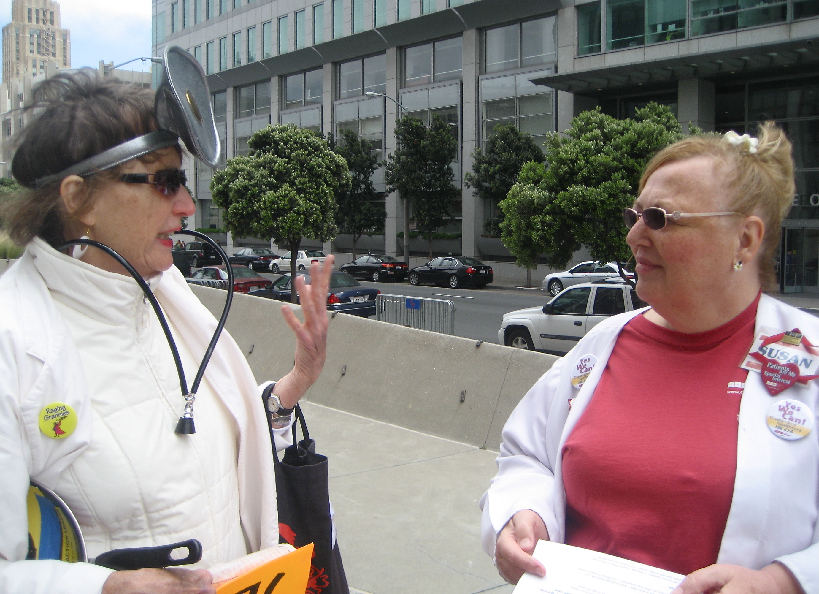 Since the Raging Grannies and their allies in the movement for Single Payer couldn't get an audience with Nancy Pelosi, they floodedd one of her staffers with questions, songs, and skits.