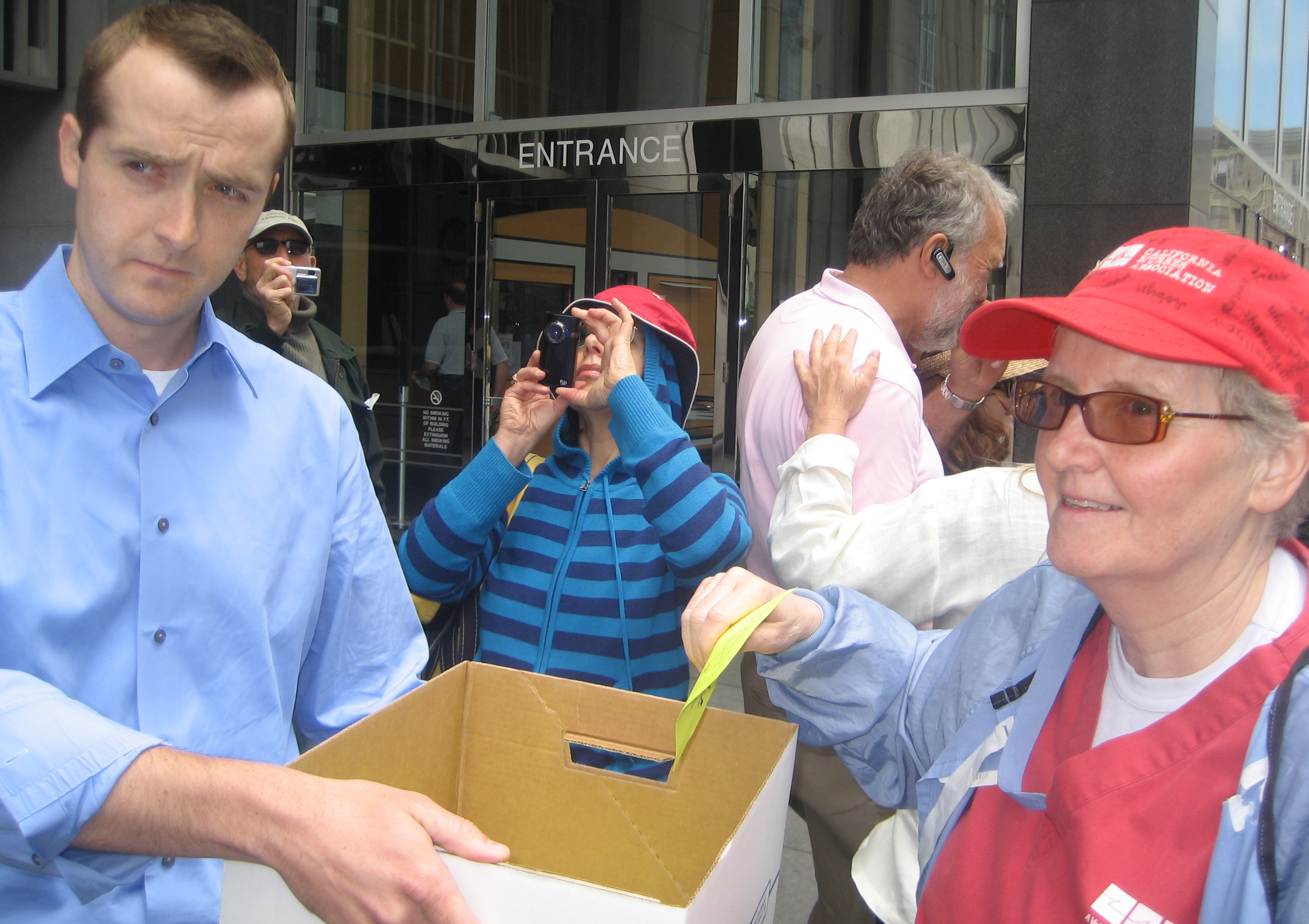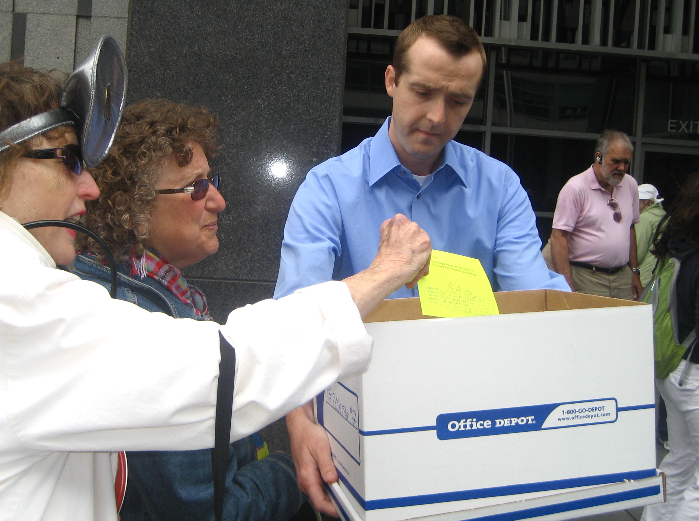 Top Photo: Michael Herbert of Nancy Pelosi's staff is questioned by a doctor (off camera) as a nurse gives him a yellow card with her message to the boss. Support Single Payer Healthcare for the Nation!