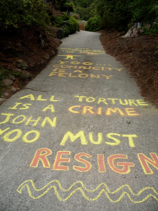 CODEPINK Golden Gate and Act Against Torture went up to John Yoo's house today in the Berkeley Hills. We unfurled a bright pink banner and got our flyers ready for anyone who might be curious about why we were standing in this unlikely place for a protest. John Yoo is the former DOJ Office of Legal Counsel lawyer who wrote unethical and shoddy legal opinions saying that "enhanced interrogation techniques" were legal, contrary to U.S. and international law.