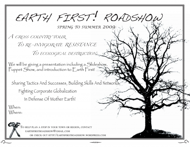 The Roadshow will be traveling with a variety of skills, topics and resources, including: forming affinity groups and planning direct action; blockading, climbing and occupations; bioregional news from campaigns and projects around the country; tools for challenging oppression; up-to-date news on resisting the Greenscare; independent and corporate media work; community organizing strategies; and more. A primary goal of the tour is to build the skill-base of our network. If you want specific areas of interests covered, let us know and we can tailor the stops to meet local/regional desires.