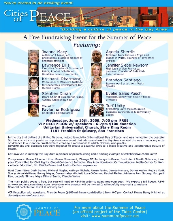 Cities of Peace: Building a Culture of Peace in the Bay Area. Features eco-pioneer Joanna Macy, Watts peacemaker Aqeela Sherrills, SF First Lady Jennifer Siebel Newsom, Summer of Peace ED Lawrence Ellis, author Stephen Dinan, spoken word from YouthSpeaks, art from Favianna Rodriguez, music and more. Get involved in making the Bay Area a pioneer of peacebuilding and a shining example of collaborative community! Co-sponsored by BayNVC, free fundraiser for the Summer of Peace. http://tinyurl.com/pxra95