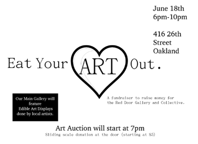 The Red Door Gallery and Collective needs your help! We are having a fundraising party in hopes of collecting enough cash to apply for non-profit status. Come and enjoy the edible art displays made by local artists. A live art auction will start at 7pm. A great event to buy wonderful art on the cheap! Hope to see you there. We are asking for a minimum $5 donation at the door.