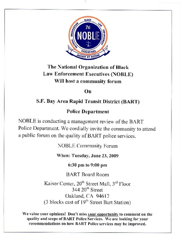NOBLE will host community forums at 6:30 p.m. in San Francisco on June 22 and in Oakland on June 23 to receive your input on the quality and scope of BART police services.