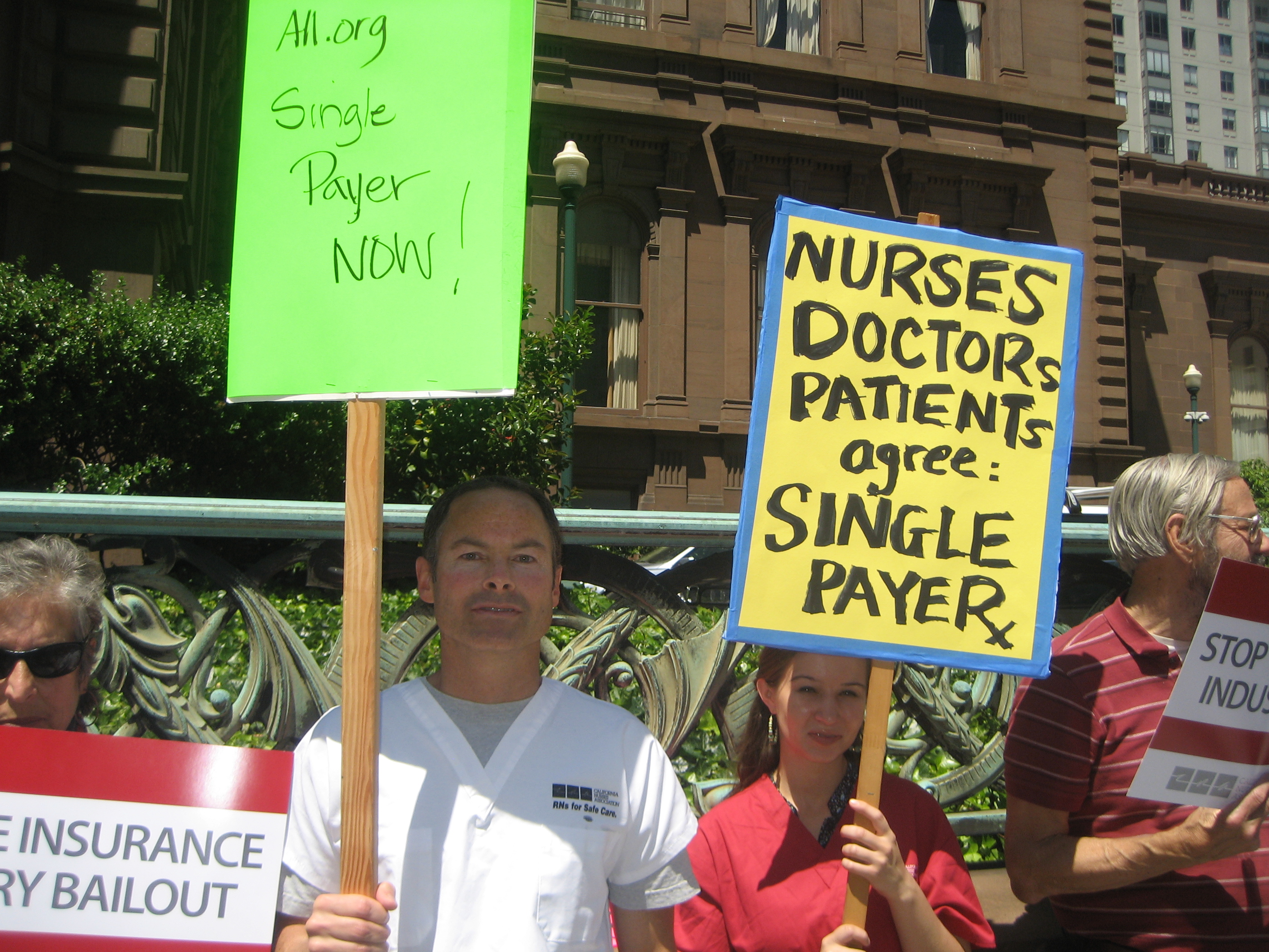 Nurses, patients, doctors, and Raging Grannies costumed as nurses, patients, and doctors joined other healthcare advocates to protest Secretary of Health and Human Services Kathleen Sebelius' visit to San Francisco today. Secretary Sebelius recently said that "single-payer is not part of the discussion." Her statement reflects the the fact that politicians are looking out for their big pharma and insurance industry donors despite private healthcare industry's long record of patient abuse.