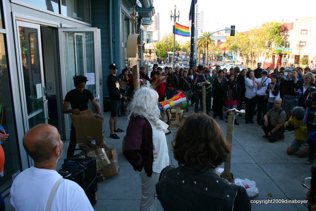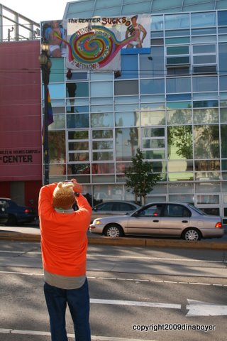 On June 25th 2009, a banner was hung from San Francisco’s LGBT Center. After it was hung a group of people called Gay Shame gathered outside the center to show how they feel about the LGBT Center and it’s policies. Their performance was exciting, adventurous, and creative. Many people identified with their message. While they protested they made demands from their community center.