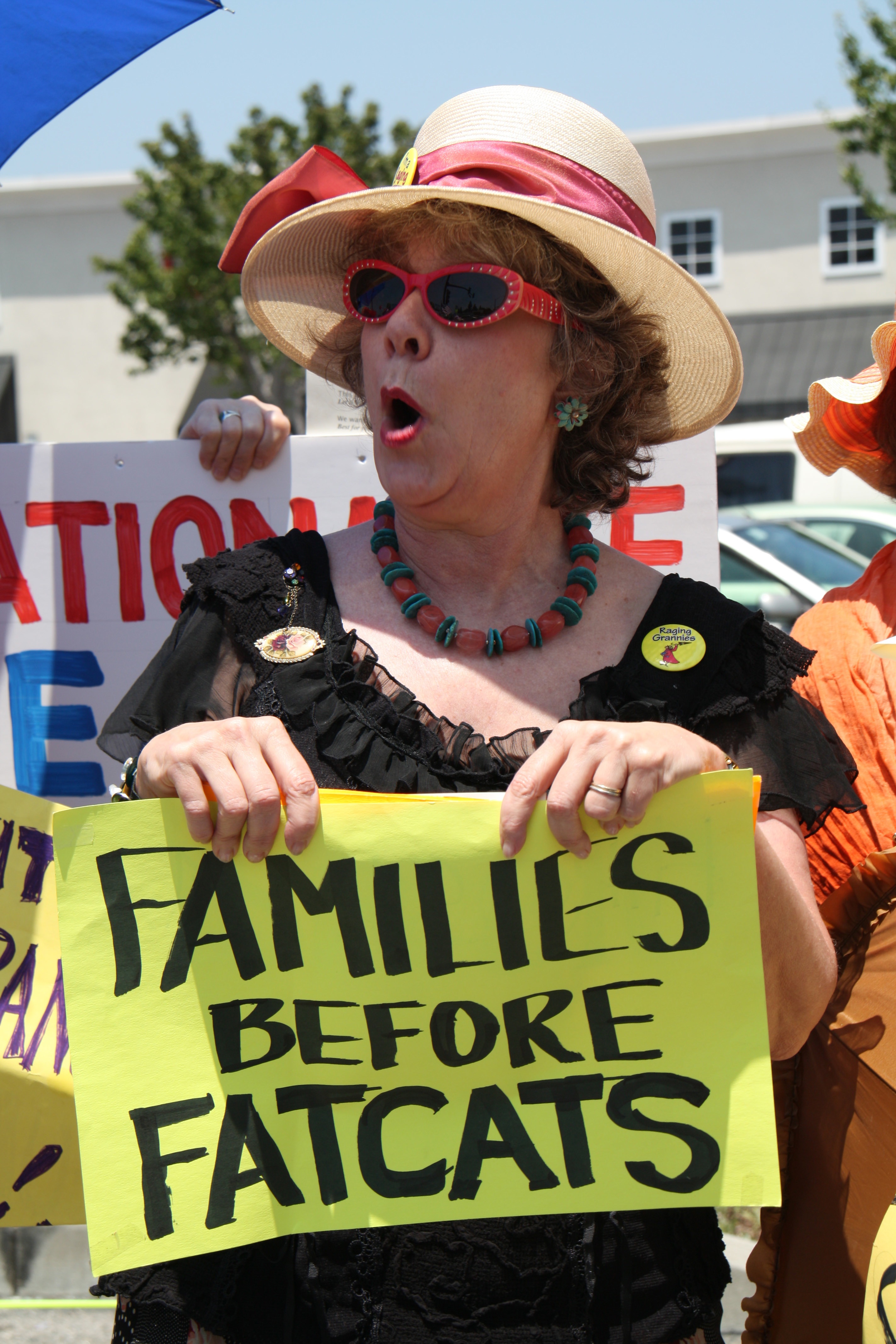 Tea party goers were particularly irked by our refrain in the song below. It served us well, we sang it loudly when they started yelling rude comments our way. Our counter demonstration of about 100 was loud and proud!