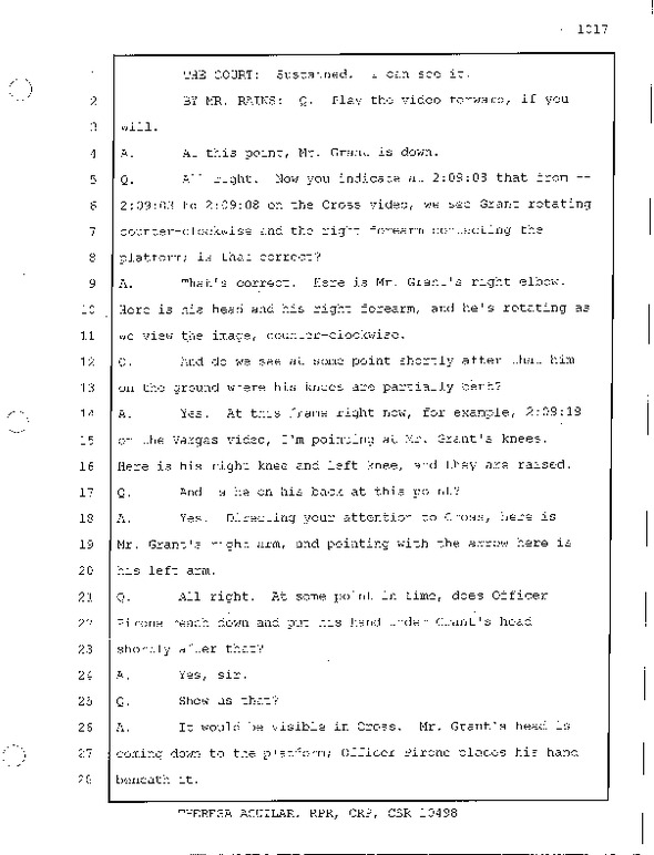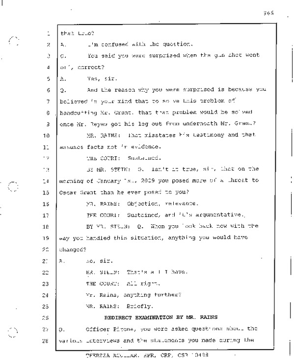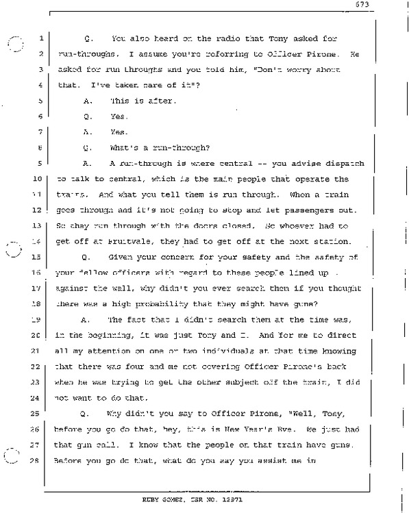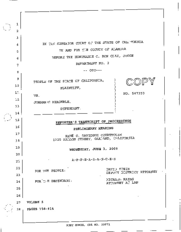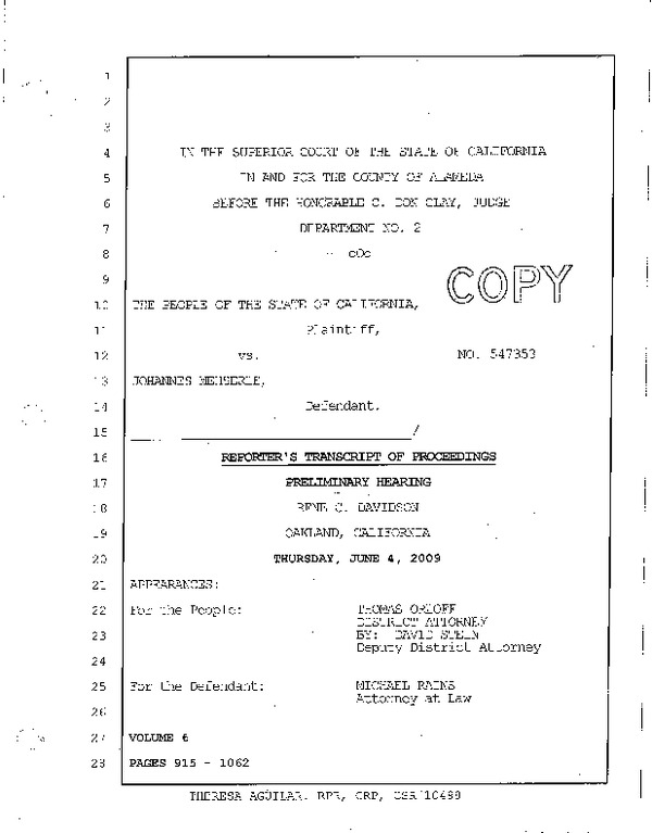 From the PEOPLE OF THE STATE OF CALIFORNIA VS. JOHANNES MEHSERLE trial, here are the full court room transcripts of the final three days of the preliminary hearing -- May 27th, June 3rd, and June 4th at the Alameda County court house.