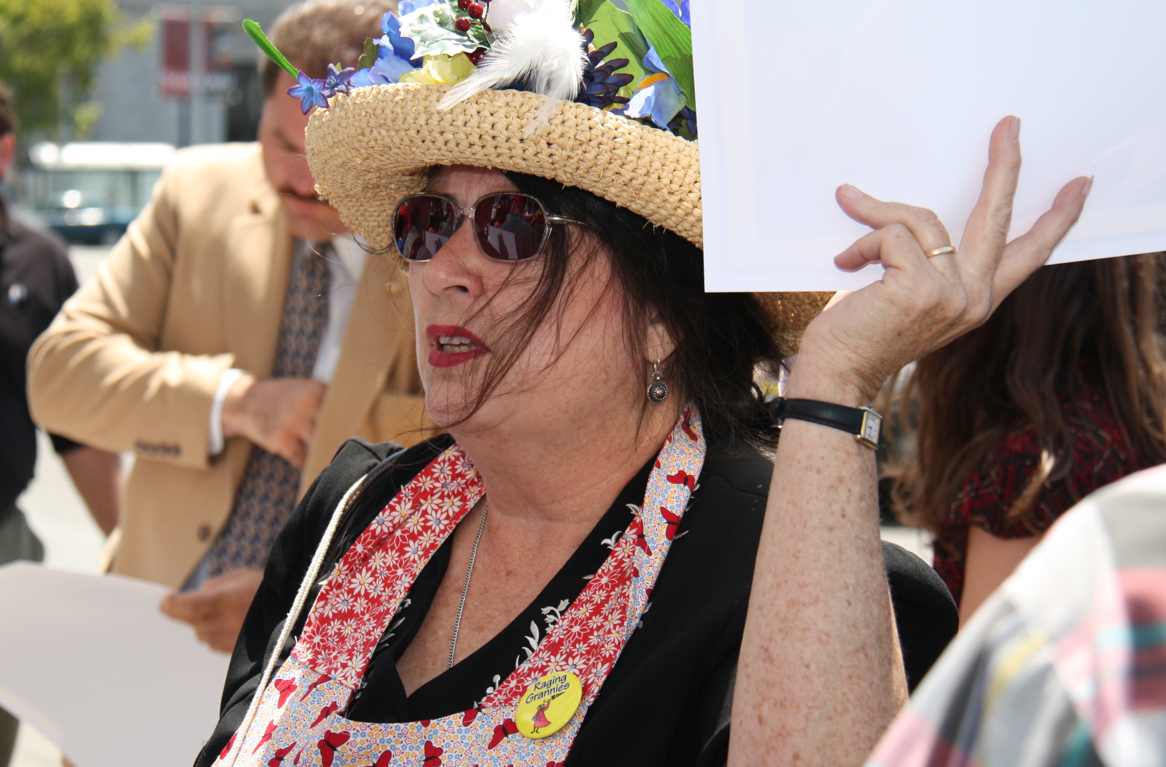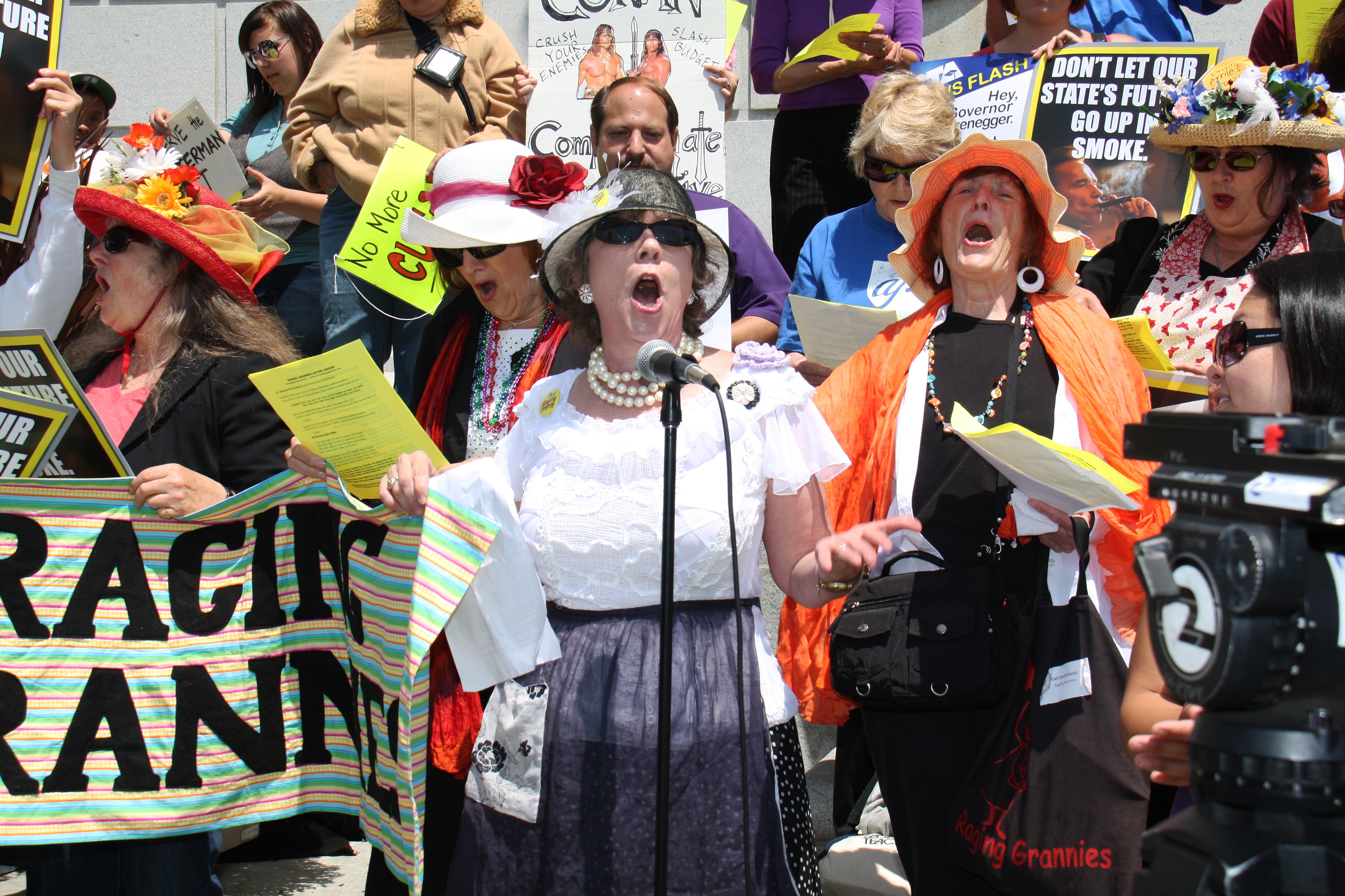 Top Photo: The Raging Grannies and others stand inspired by the words of Rosie Bonds-Kreidler, right, outspoken activist for seniors and health care.