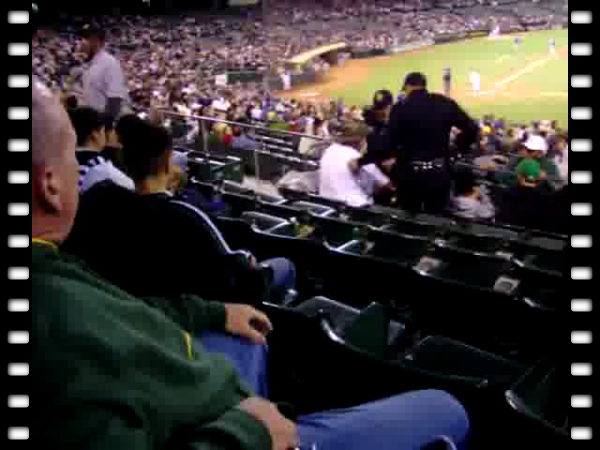 Raw video,August 04/09:Oakland.TEXT FROM SOURCE:Even though the guy shows his ticket, I don't think that's his seat. He came over a little earlier, super drunk. He wasn't angry really, just obnoxious - hollering and making a scene. He was downing all these little bottles of vodka, and started harassing the kids behind him. A's security came to check him out when he started yelling profanities.