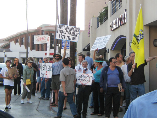By keeping close control over the attendance at the meeting, the Hillcrest Town Council managed to ensure Davis a mostly sympathetic audience. The real debate took place outside the meeting, as crowds disenchanted with the health care proposals before Congress from both ends — progressives who want to see a single-payer system replace the health insurance industry as well as conservatives who want to see less, not more, government involvement and funding of health care — squared off. Though no violent incidents were reported, a number of impassioned conversations took place, often pitting supporters of single-payer against people opposed to any role for government at all.