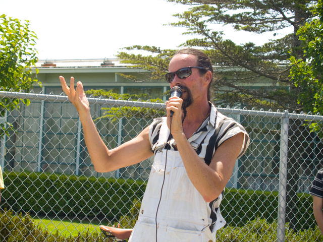 A memorial rally and bike ride took place in Santa Cruz on August 16th. At Bay View Elementary School, Takashi Yogi rode his bicycle to generate power for an amplified sound system. Speakers addressed the crowd, composed of mostly cross-town type bikers, about the need for safer transportation conditions for people commuting without automobiles, such as students that walk and bike to schools.