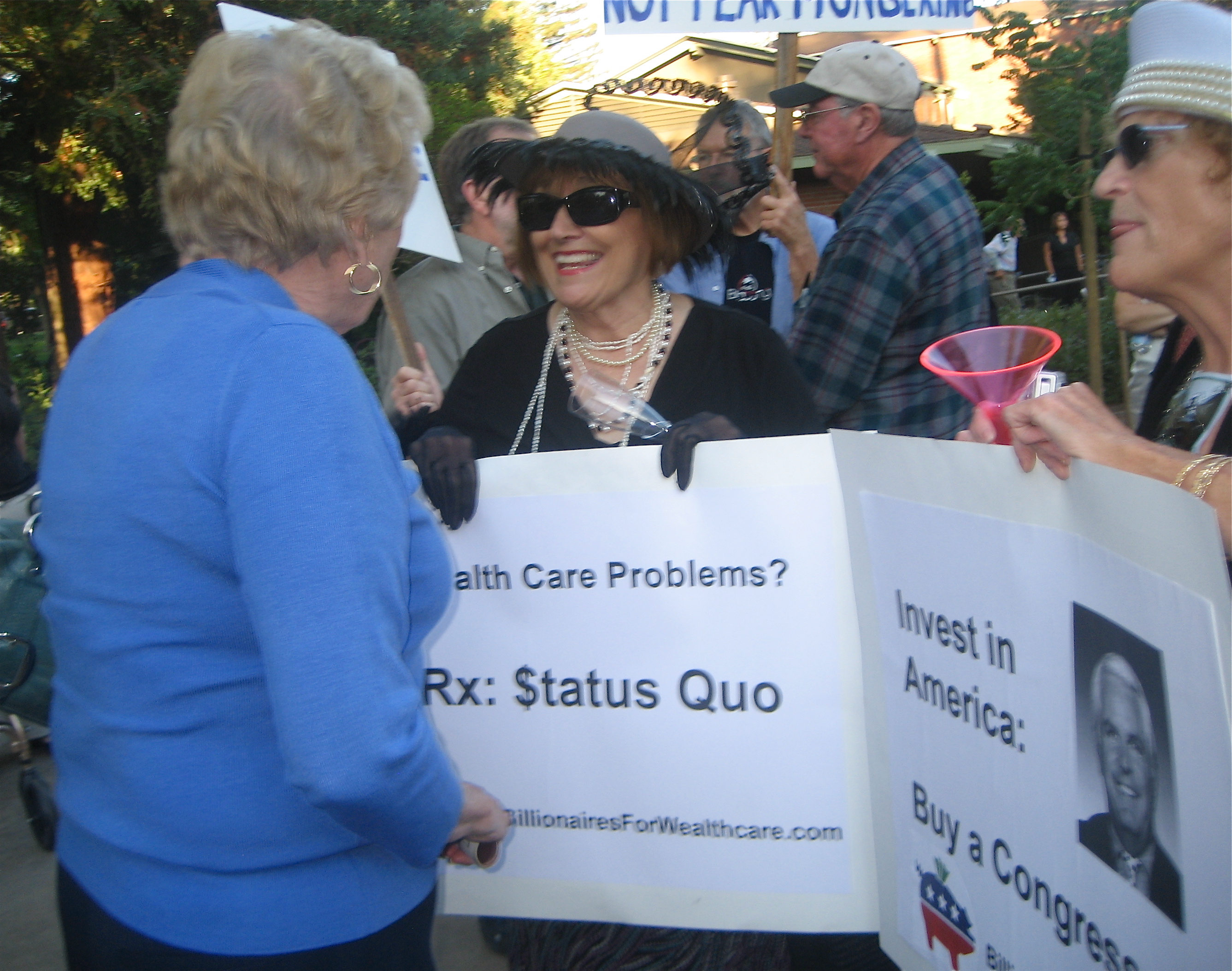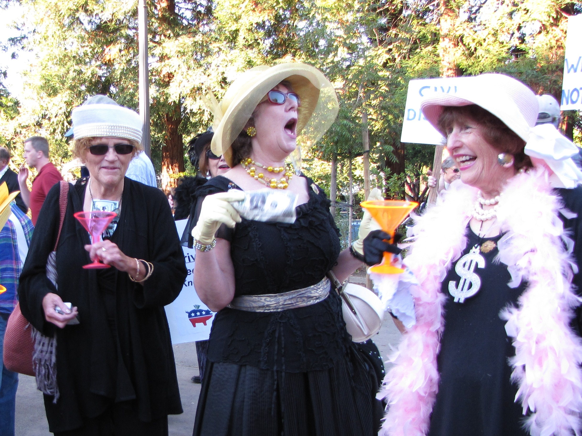 Tea Party "patriots" tell the Raging Grannies dressed as Billionaires for Wealthcare what the term TEABAGGER really means.