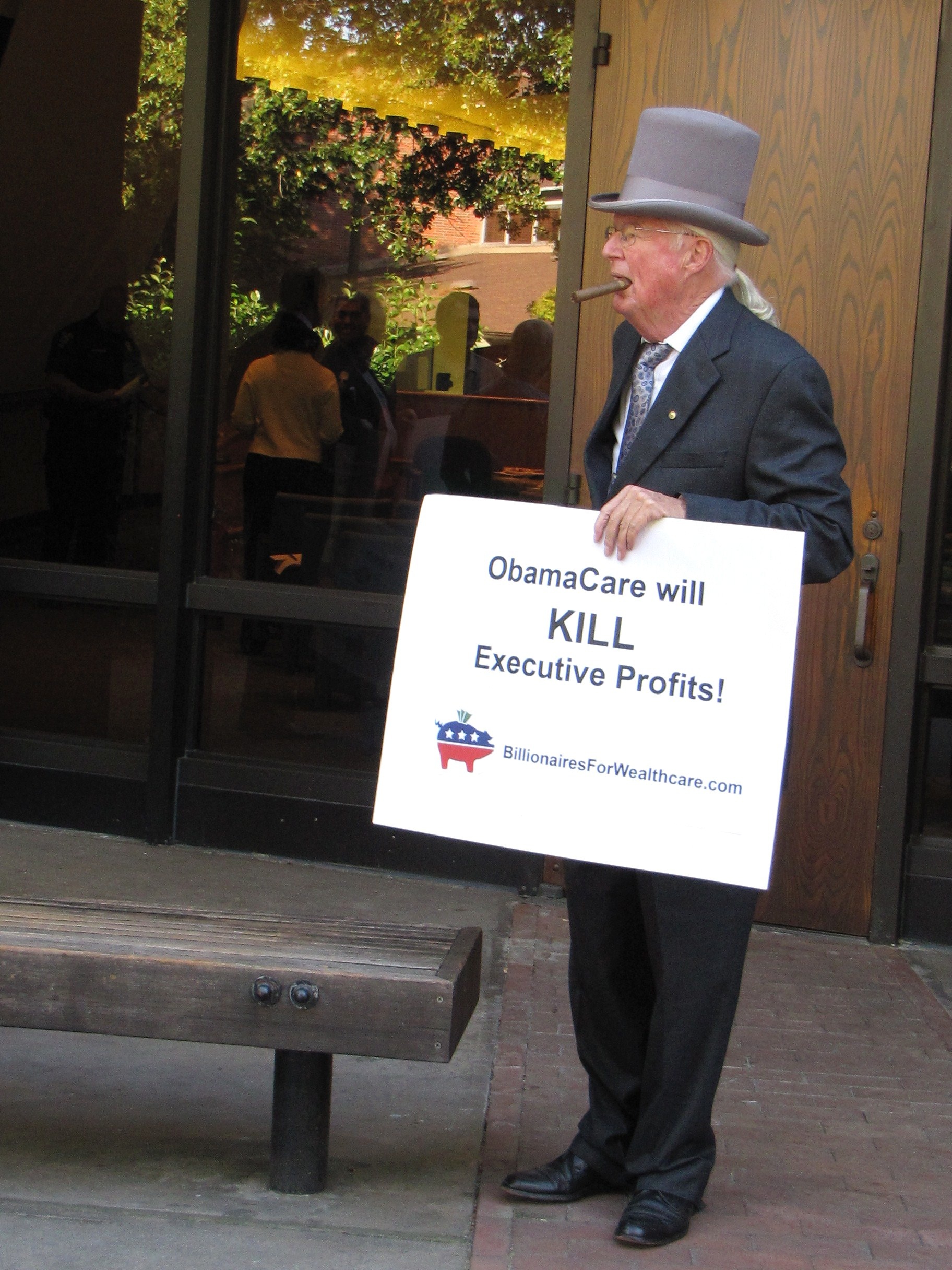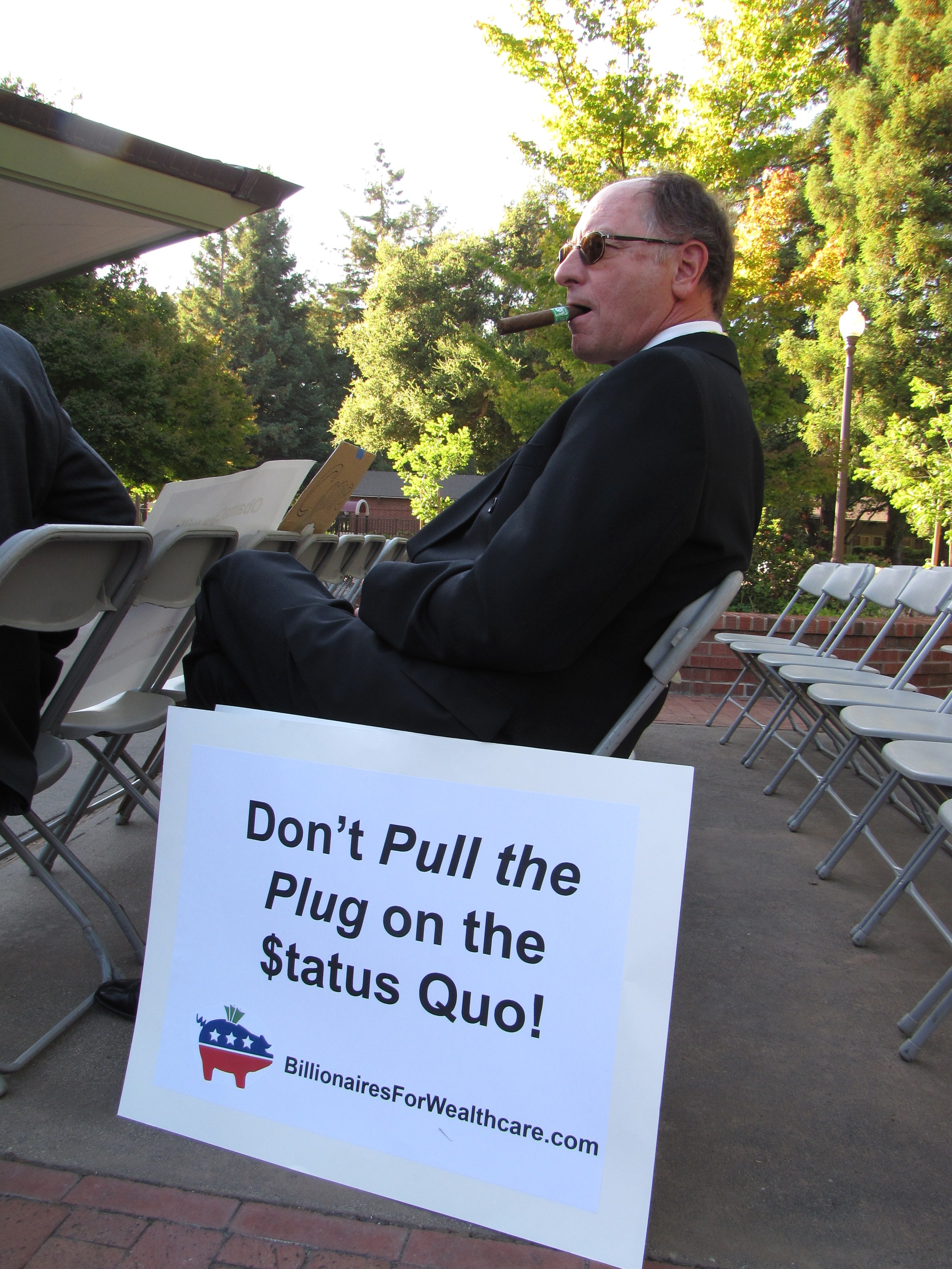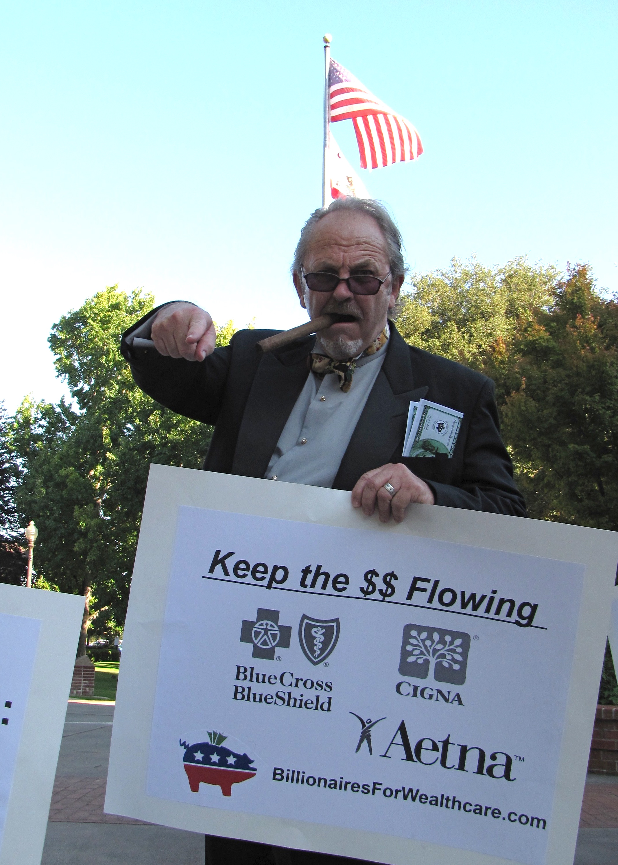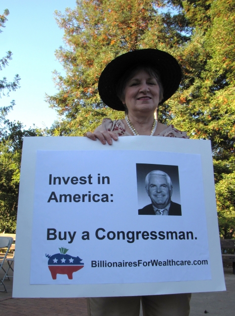 Billionaires for Wealthcare defused some of the tension that the Tea Party People brought to the event with creative street theater.