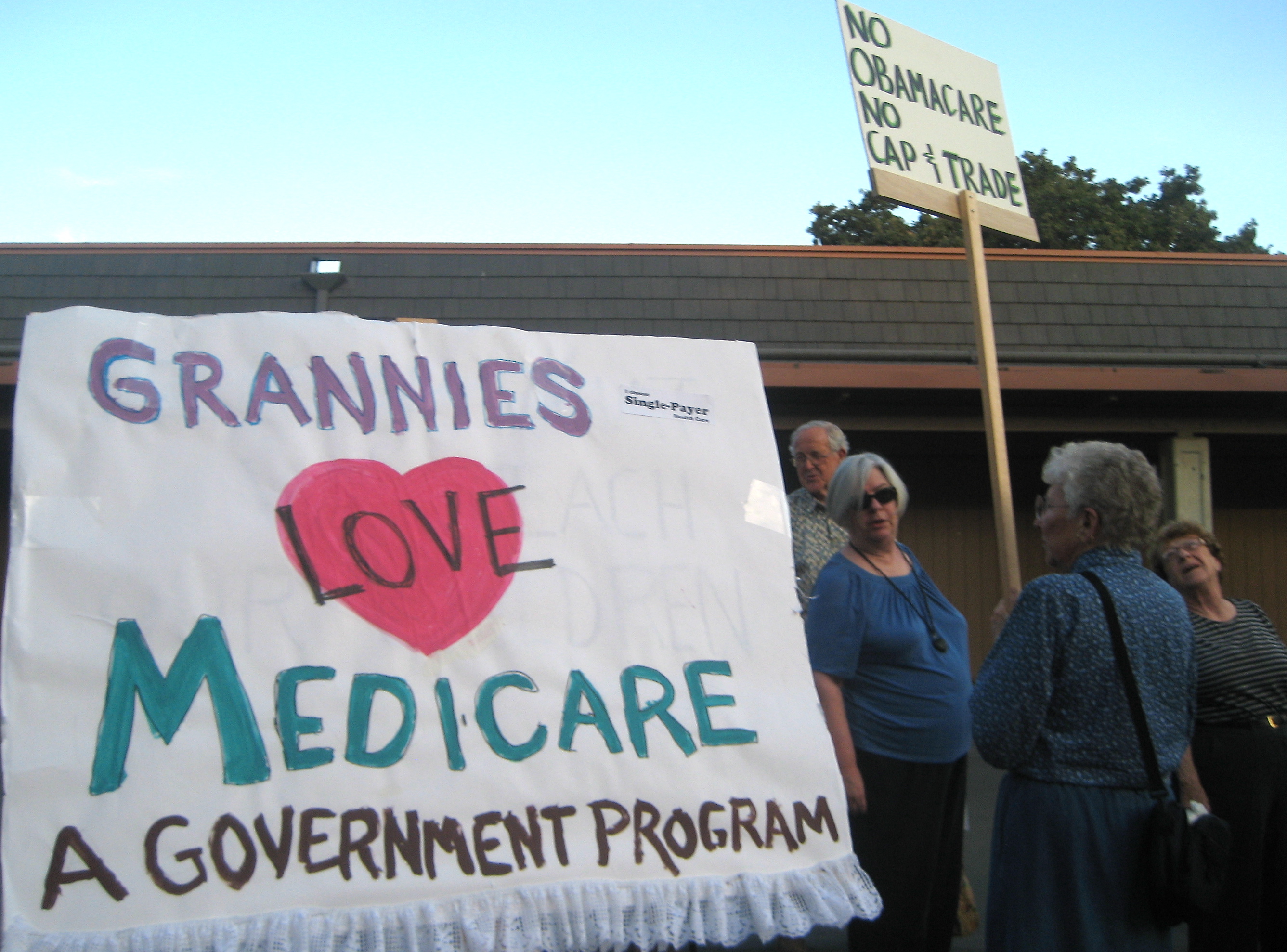 top photo: On the left, a Raging Granny supporting Medicare for All. On the right, right wing grandma against Obama.
