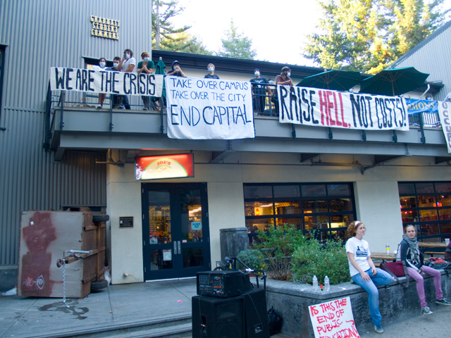 On September 24th, students and workers at UC Santa Cruz began the occupation of the Graduate Student Commons as part of a day of action at all UCs across the state. The building is located in a central location on campus, across from the Bay Tree Bookstore. Occupiers are calling for another day of walkouts on Friday.