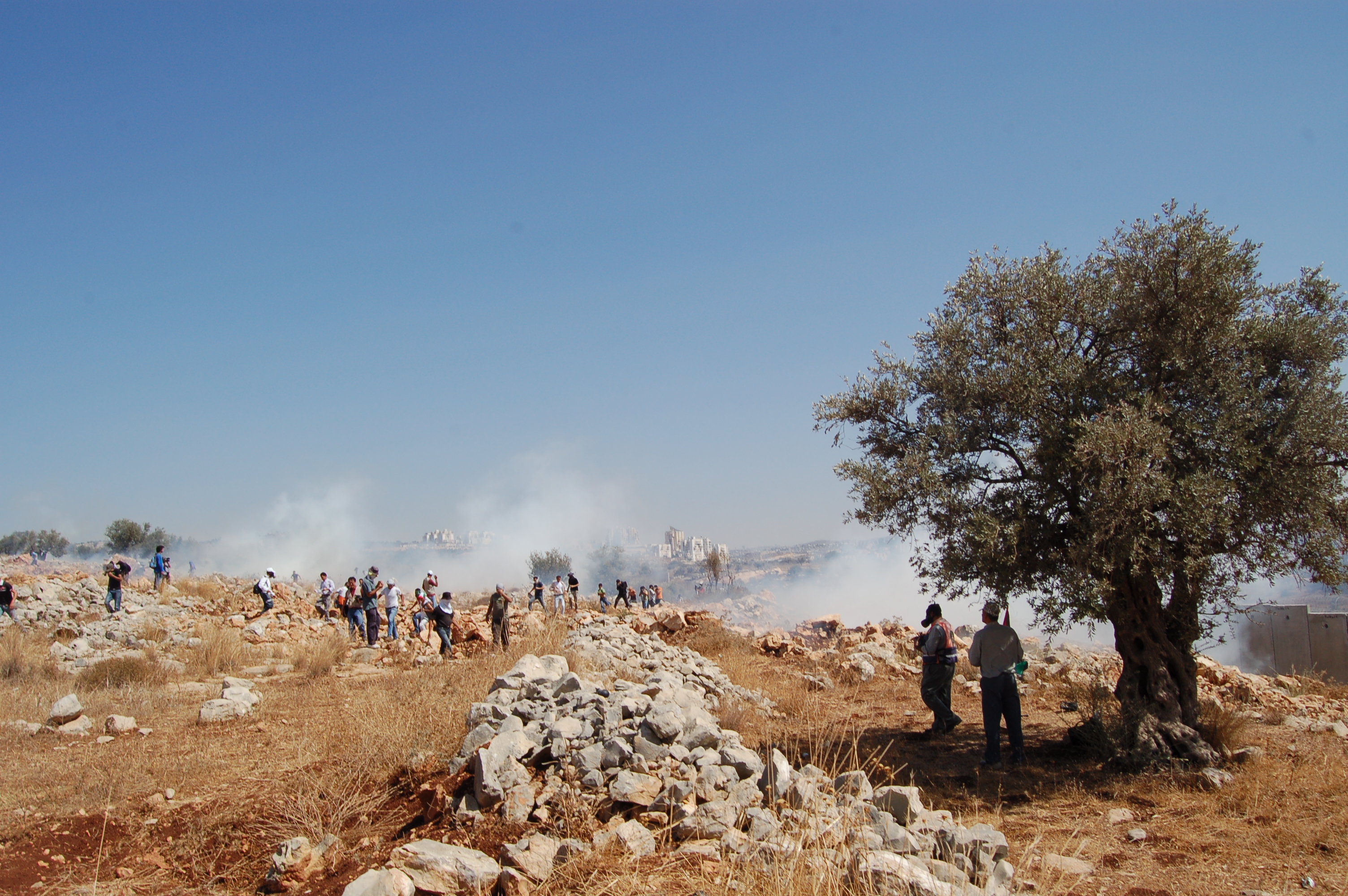 On Friday September 25, the weekly demo against the annexation of land in Nilin took place. Participants walked to the wall and confronted occupation soldiers, demanding them to leave their village land. The Israeli military replied with the shooting of tear and shook gas and moved into the area arresting three people.