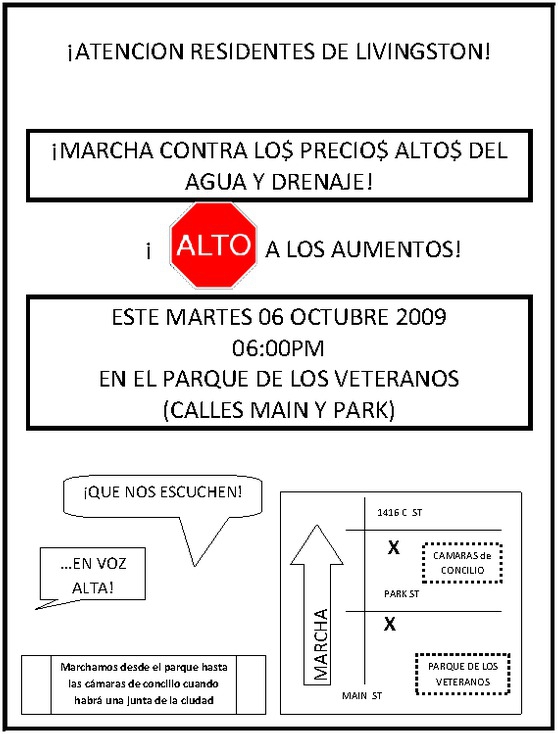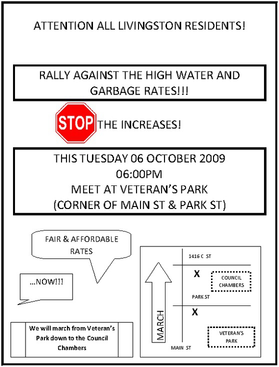 Meeting at Veteran's Park (Main & Park) in Livingston, Ca (Merced County) at 06:00PM and then marching down to City Council Chambers (1416 C St). Join us for fair and affordable water and garbage rates!