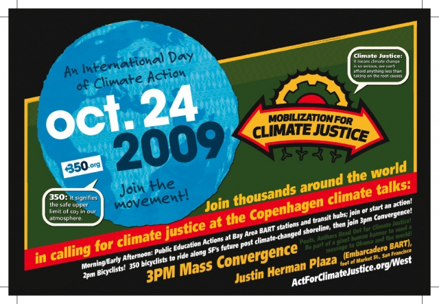 Join thousands around the world in an International Day of Climate Action. Participate in morning events including Art in BART, surfing at Ocean Beach, and biking SF's future post-climate-change shoreline. Then at 3 pm join the Mass Convergence at Justin Herman Plaza (Embarcadero BART) and help us deliver the message that we need climate justice now!