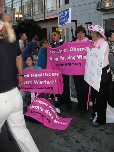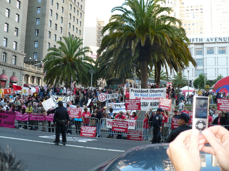 Given the sizable 9/11 Truth contingent, and the large "Investigate 9/11, End the War Now!" banner in the corner of Powell and Geary right outside the St. Francis Hotel, we still were ignored by ABC 7. They completely omitted that we were there in this story: http://abclocal.go.com/kgo/story?section=news/local/san_francisco&id=7067308